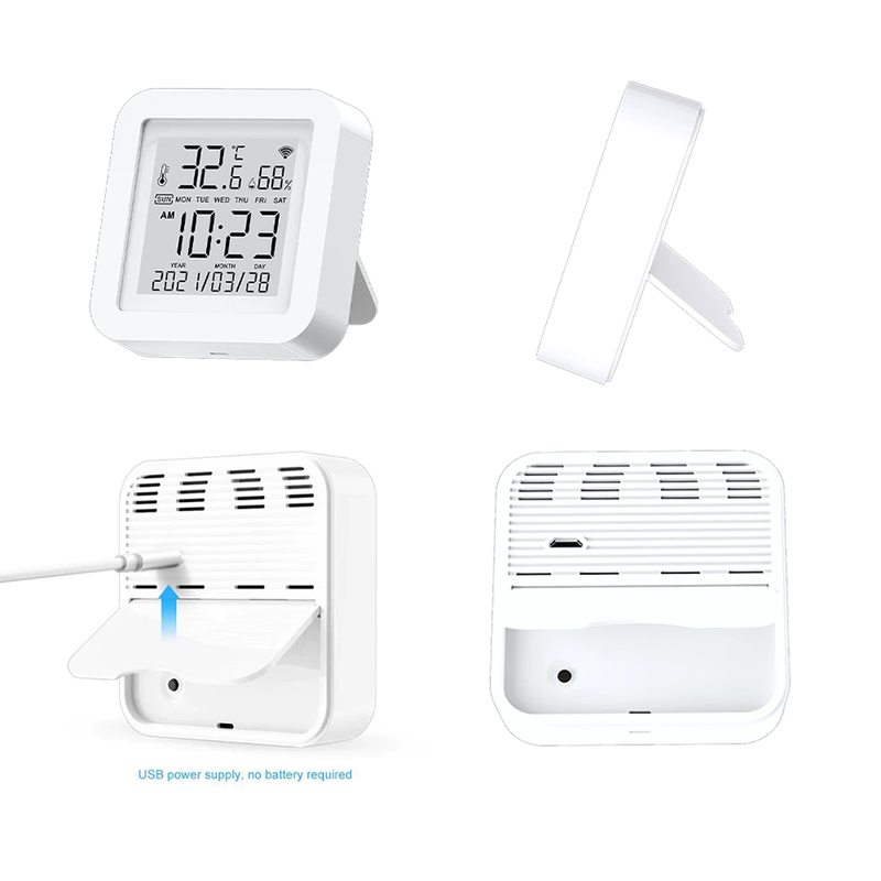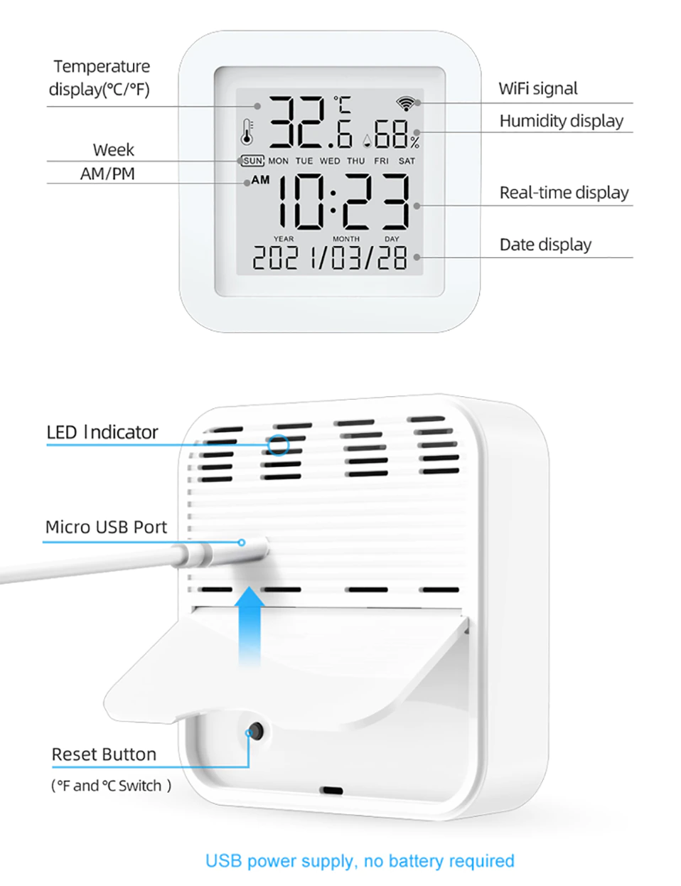 Die sensor nutzt USB power liefern. Im vergleich mit der batterie version, wird der sensor monitor die temperatur und feuchtigkeit in echtzeit. Die sensor wird bericht, wenn die temperatur und feuchtigkeit änderungen sehr wenig. Sie können die änderungen in die wert auf die APP oder display.