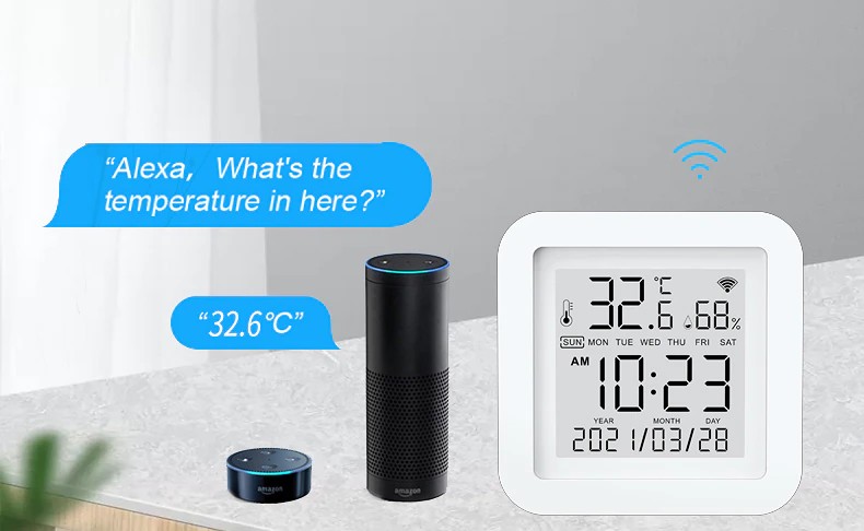 Die sensor unterstützt Amazon Alexa, Google Home Asistant. Sie können überprüfen sie die aktuelle temperatur und feuchtigkeit durch stimme.