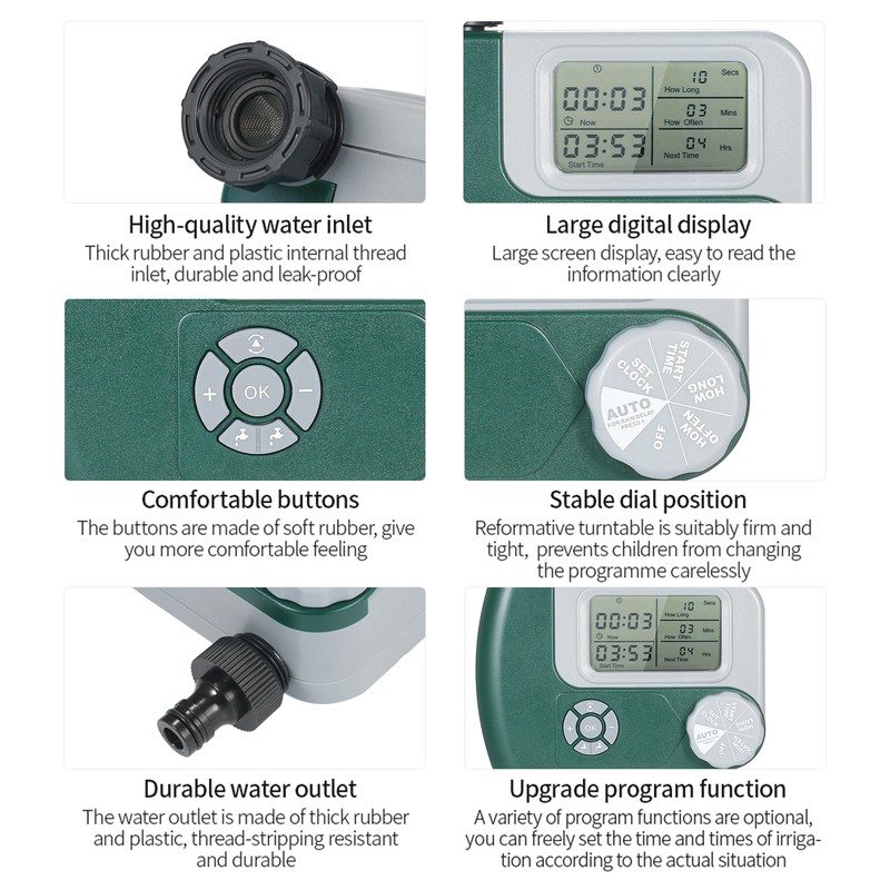 The water saving timer saves water and time, effectively uses water resources, and improves the efficiency of automatic irrigation. Can be used in gardens, agriculture, vegetables, green forests, etc.
