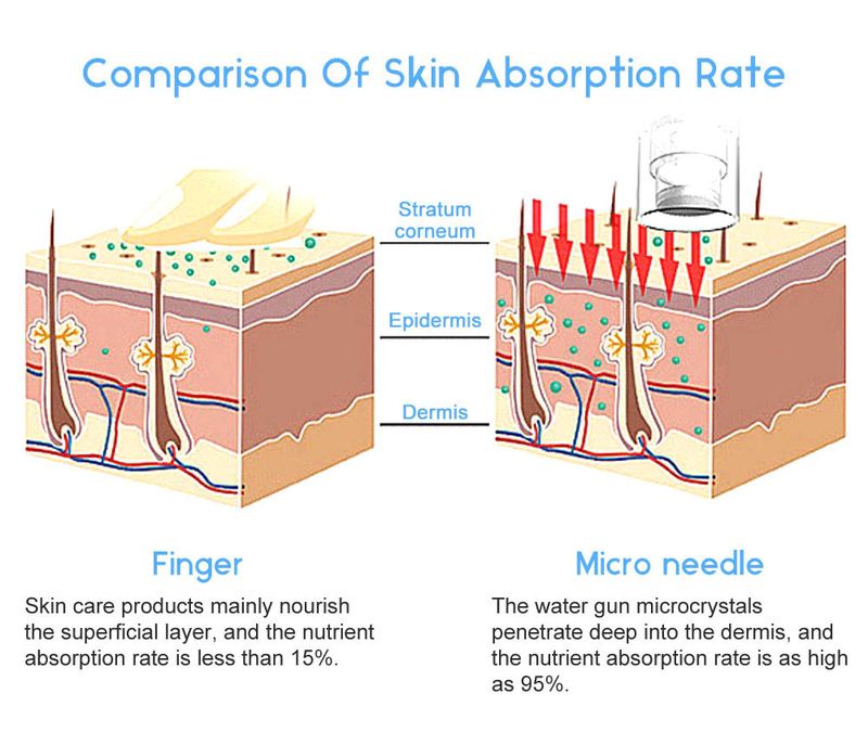Nanochip material is high purity single crystal silicon,The surface of the nanochip of a 49 micron length(1mm=1000 micron) tip arrangement,broken epidermis promotes absorption,promote cell regeneration,the 3D nanochip area length is 3mm,5D nanochip area length is 5mm,Nanochip use nanoscale contacts,can be as thin as 80 nanometers,as short as 0.1mm,just open the horniness of the skin,will not touch the dermis.It not only solves the problem of skin absorption, but also makes it painless and non-invasive.
