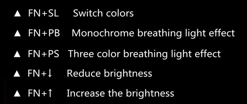 3 adjustable backlight colors, press FN + SL to switch the color, blue, purple and red color