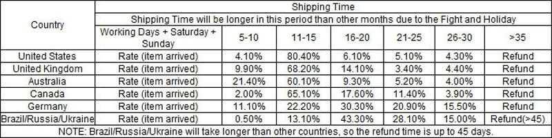 2) Los artículos se envían desde China por correo aéreo, llegando a la mayoría de los países dentro de 10 a 20 días hábiles. Aquí está el tiempo de envío por China Air Post