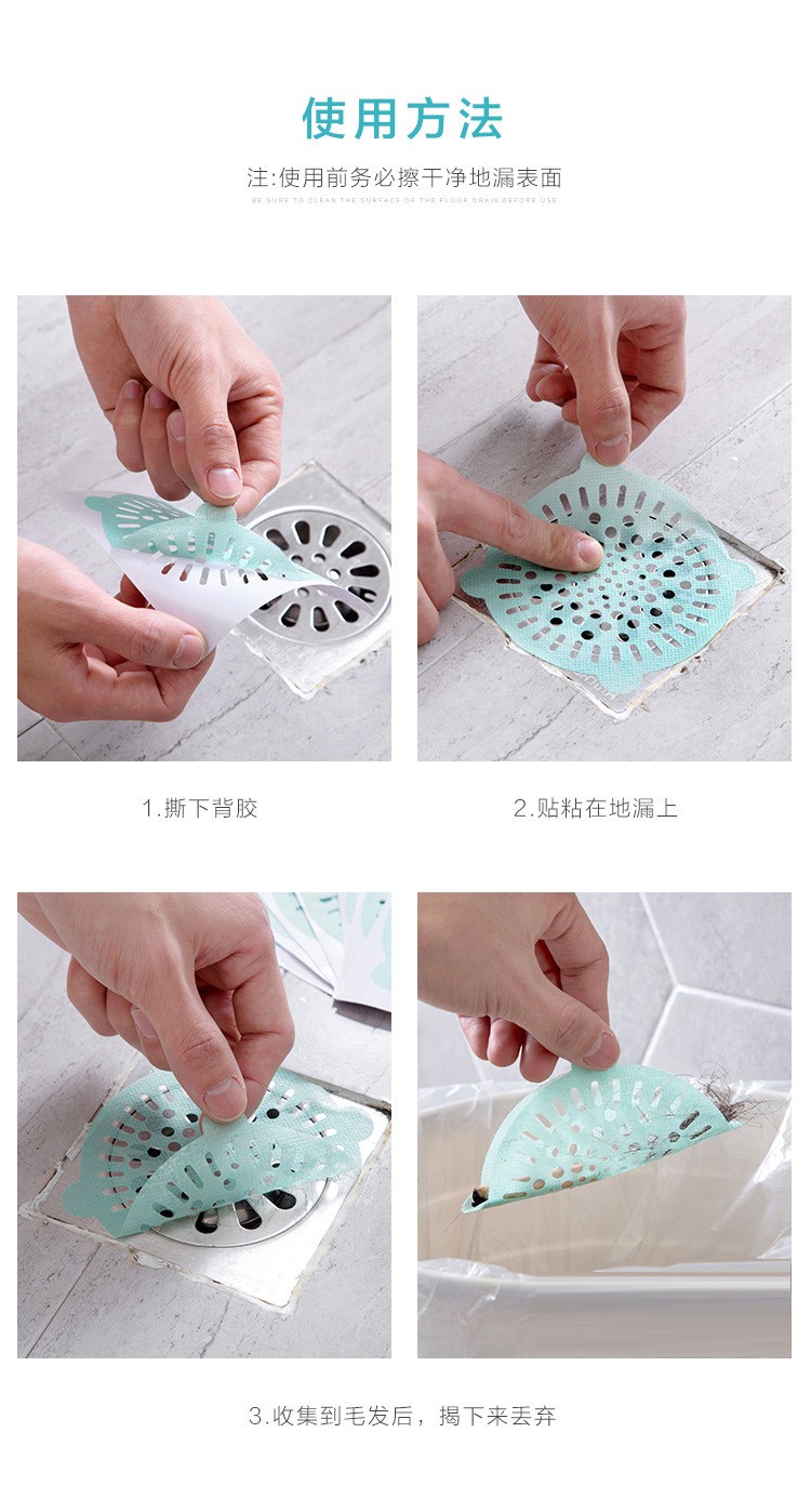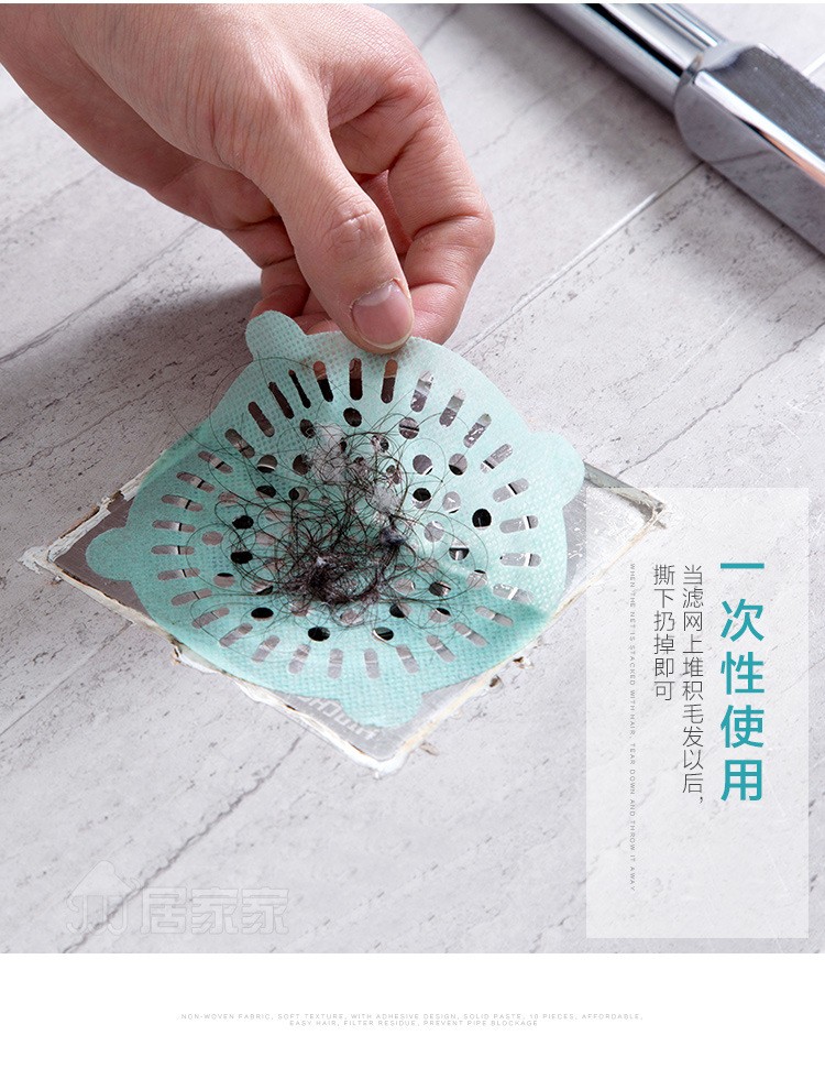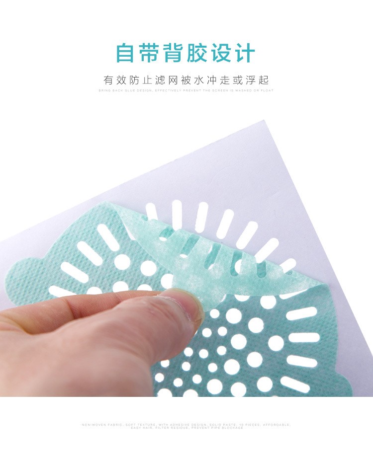 Tela no tejida, textura suave. Con diseño adhesivo, firme. Filtra fácilmente los restos de pelo, antibloqueo. De tamaño medio y malla fina, puede filtrar eficazmente el cabello, los residuos, etc. Se puede utilizar en la cocina, el baño. Trajes para lavabos, lavabos, bañeras, duchas y bañeras.