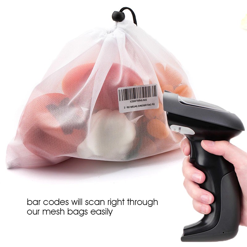 Las bolsas de productos reutilizables se empaquetan de una manera respetuosa con el medio ambiente, utilizando una bolsa de poliéster reutilizable con cordón en lugar de una bolsa de plástico. Los códigos de barras se escanearán directamente en las bolsas de productos reutilizables, y el verificador nunca tendrá que sacar las frutas o verduras para escanearlas.