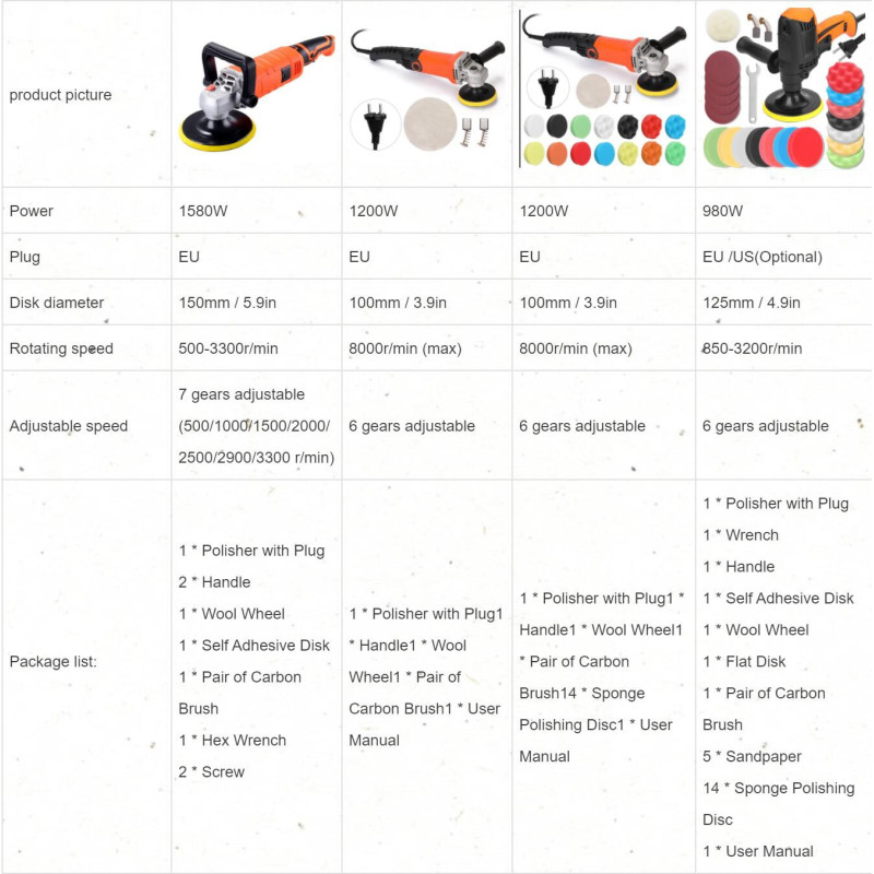 Lista de paquetes: | 1 * pulidor con enchufe 2 * mango 1 * lana de 1 * disco autoadhesivo 1 x par de brochas de carbón 1 * llave hexagonal 2 * tornillo | 1 * pulidor con enchufe 1 * mango 1 * lana de 1 x par de brochas de carbón 1 * Manual de usuario | 1 * pulidor con enchufe 1 * mango 1 * lana de 1 x par de brochas de carbón 14 * disco de pulido de esponja 1 * Manual de usuario | 1 * pulidor con enchufe 1 * llave 1 * mango 1 * disco autoadhesivo 1 * lana de 1 * disco plano 1 x par de brochas de carbón 5 * papel de lija 14 * disco de pulido de esponja 1 * Manual de usuario |
