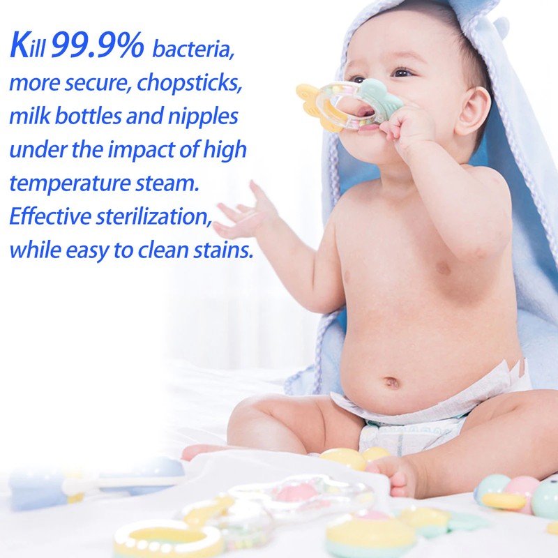 2. Mata al 99.9% de bacterias, más seguro, palillos, botellas de leche y pezones bajo el impacto del vapor a alta temperatura. Esterilización efectiva, mientras que es fácil limpiar las manchas.