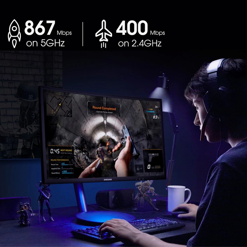 Velocidad inalámbrica de 2.867Mbps a banda de 5,8 GHz o velocidad de 400Mbps a Banda de 2,4 GHz.