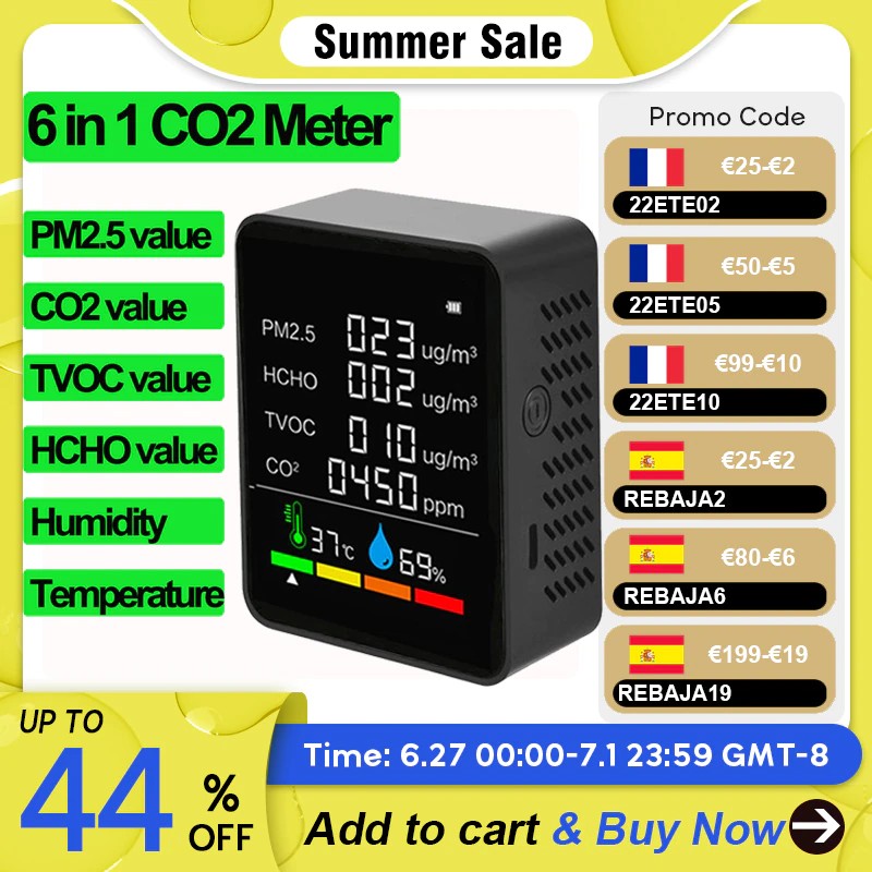 Medidor Digital De Temperatura Y Humedad 5 En 1, Monitor De Calidad Del Aire, Detector Co2 Dióxido De Carbono Tvoc, Hcho
