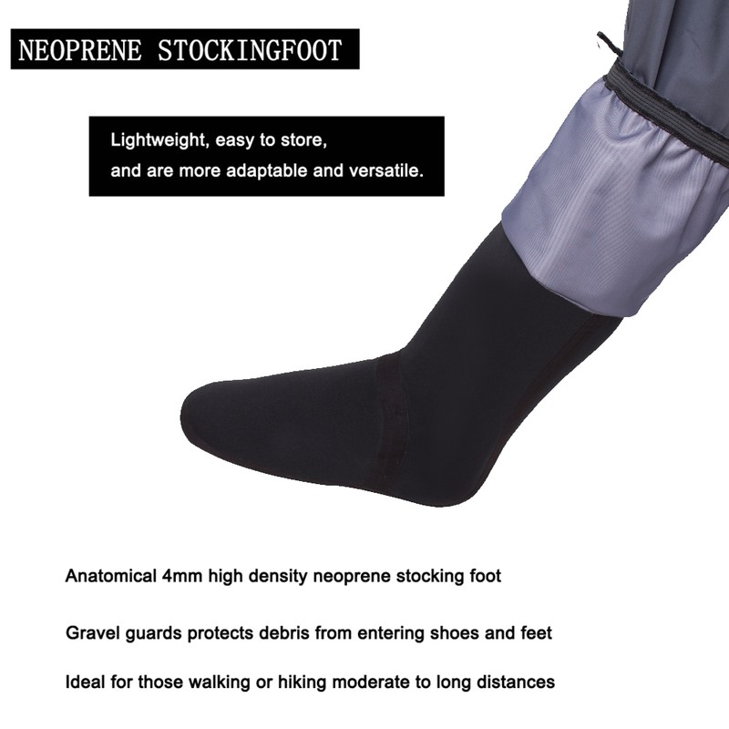 Cinturón ajustable y tirantes: Cinturón ajustable con hebilla y tirantes elásticos de hombro con hebillas reversibles. Wader se puede enrollar o convertir en cintura de longitud alta. Ideal para usar en las estaciones de verano.