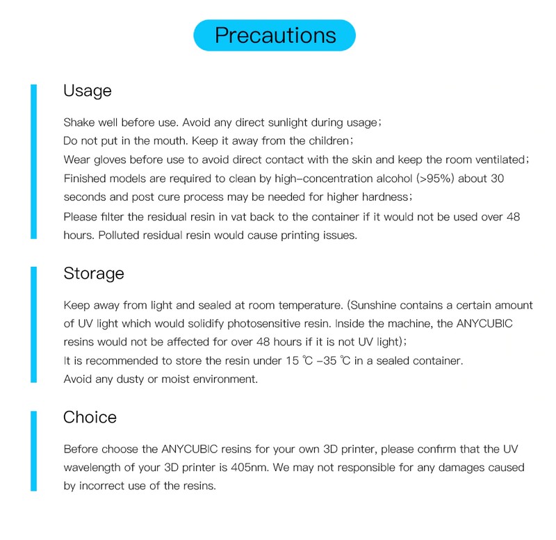 Se recomienda almacenar a 15 ℃ -35 ℃ temperatura ambiente, cuanto menor sea la temperatura, mayor será la viscosidad de la resina. Sellado, polvoriento o húmedo, que afecta a la calidad de impresión. Preservación de sombreado, el sol contiene mucha luz ultravioleta, curará resina fotosensible.