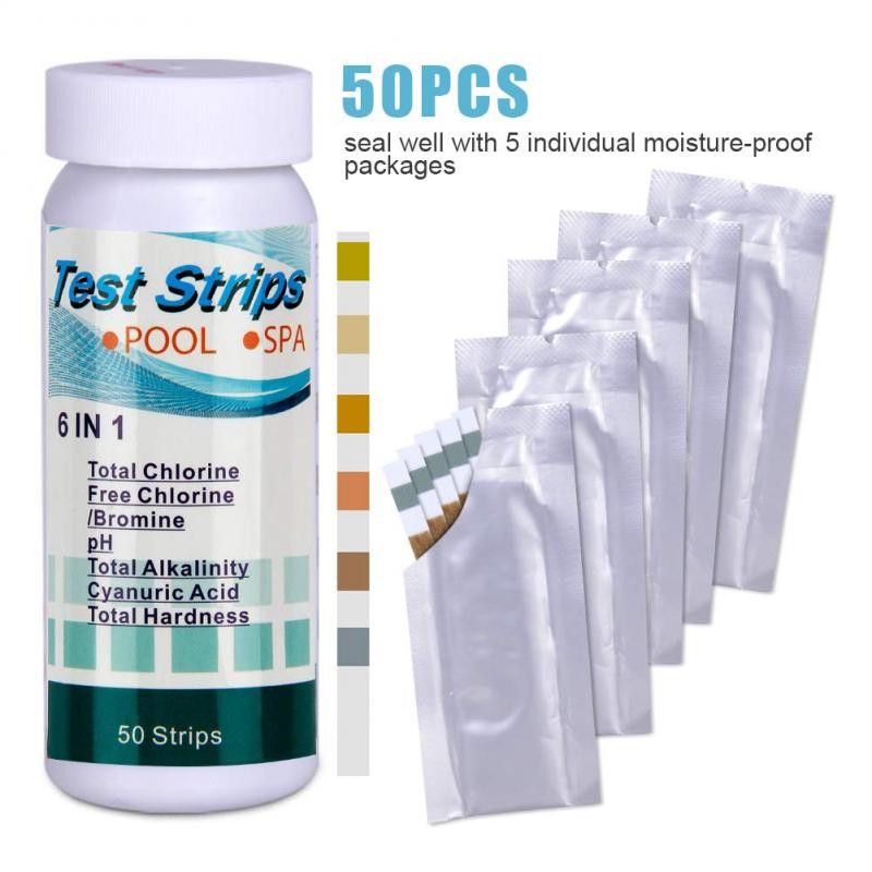 Kit de tiras de prueba 6 en 1? Pruebas de tiras de prueba de químicos de piscina para 6 parámetros: Cloro Total, cloro/Bromo libre, pH, alcalinidad Total, ácido cianúrico, dureza Total.