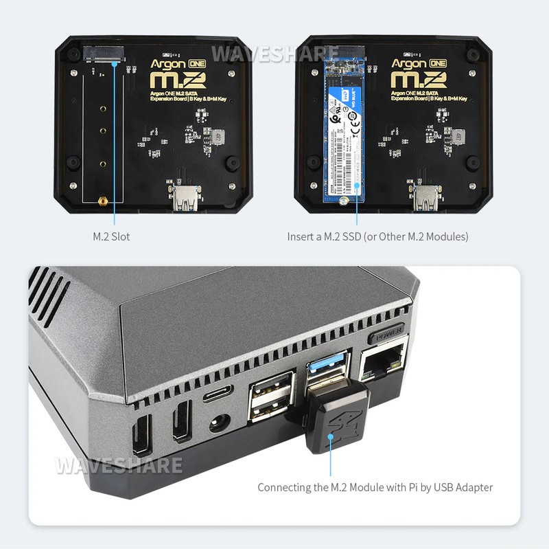 Compatible con módulos M.2 como M.2 SSD, que luego se conecta al Pi mediante un adaptador USB