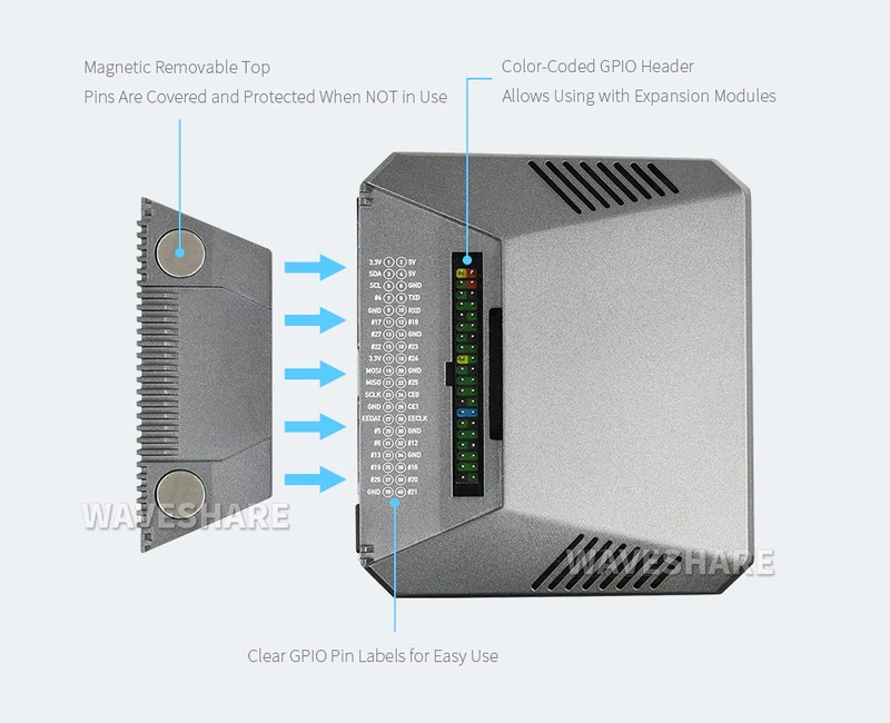 Tapa magnética extraíble y cabezal GPIO bien diseñado
