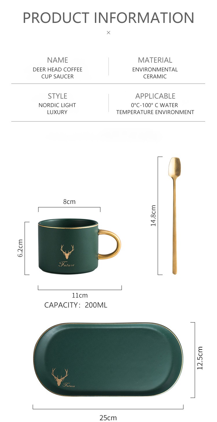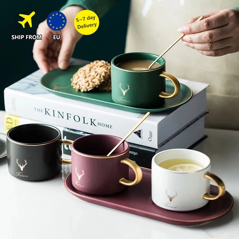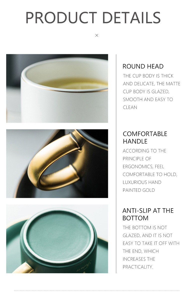 Lujosas y europeas tazas de café y platos de cerámica con borde dorado, juegos de cucharas con caja de regalo, té, leche de soja, tazas de desayuno, plato de postre