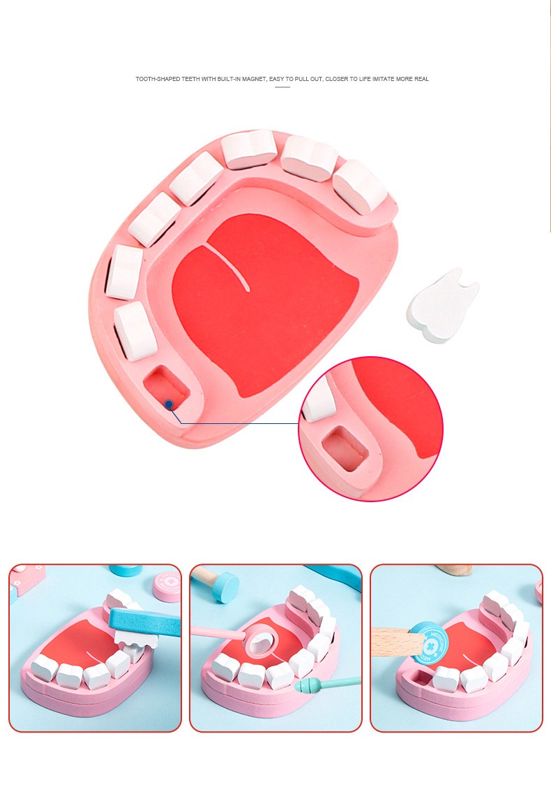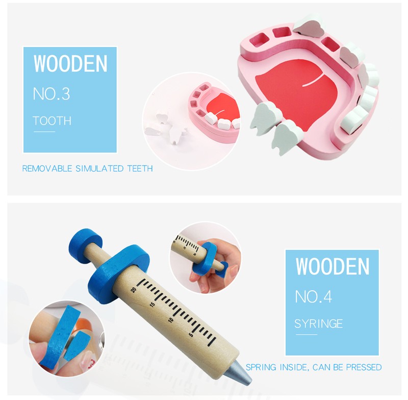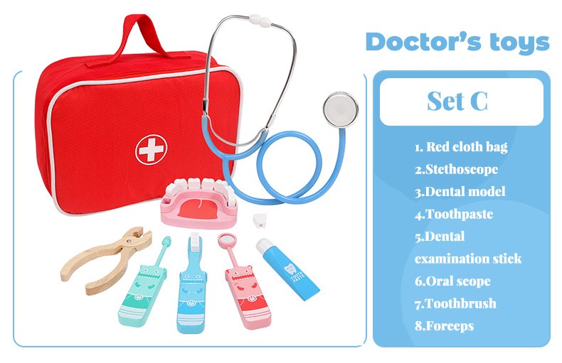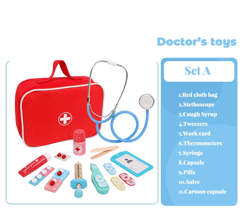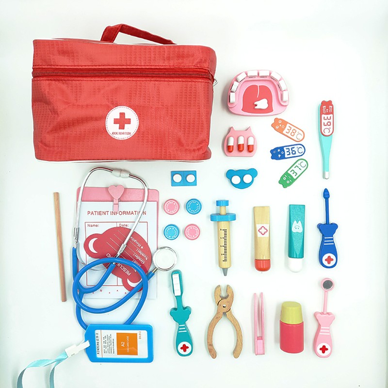 Conjunto De Juguetes Médicos Para Niños, Kit De Juegos Madera Para Niñas Y Niños, Caja Medicina Y Dentista Médica Roja, Bolsas De Tela