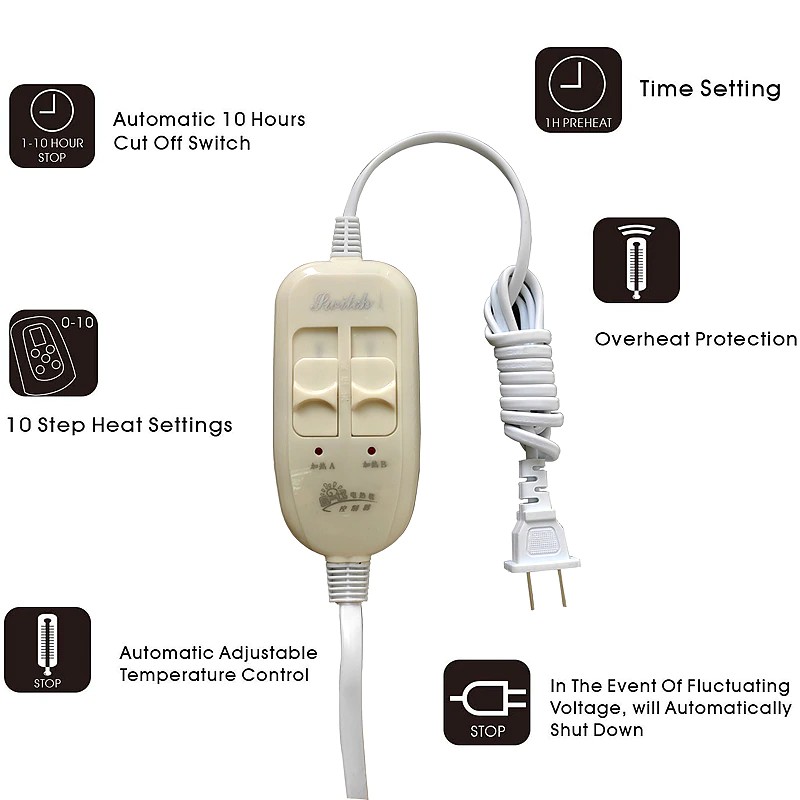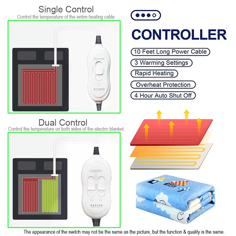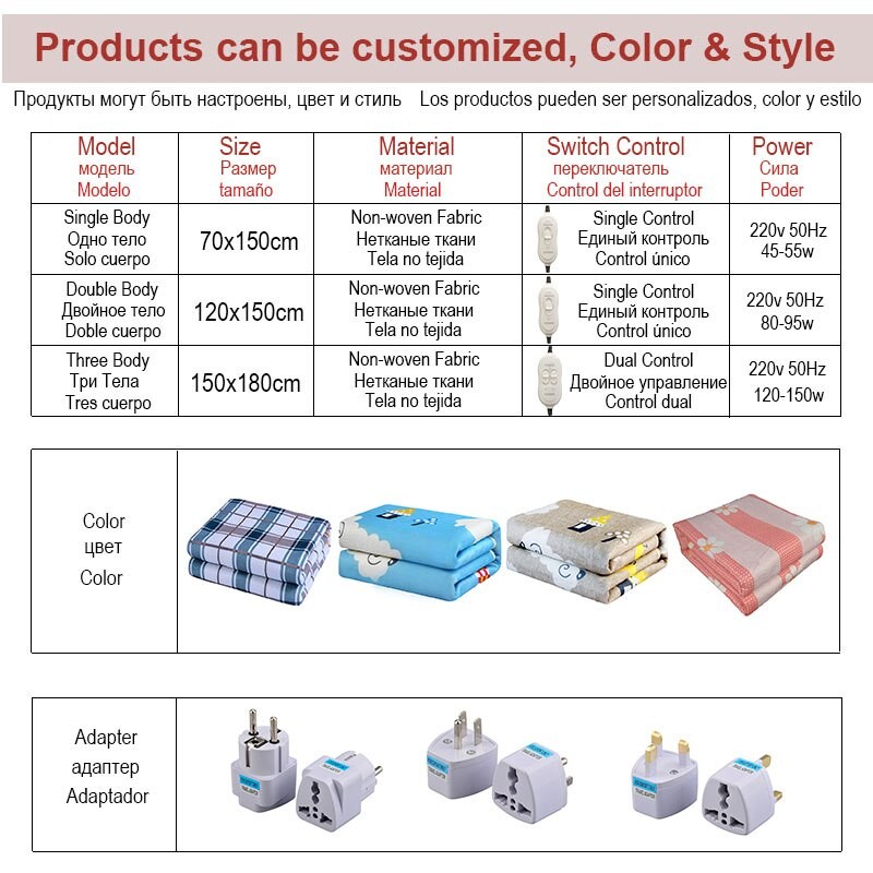Esta manta eléctrica es un control dual de 3 cuerpos, control único de doble cuerpo y cuerpo único, se puede seleccionar el color, si necesita otros modelos, puede contactar con nuestro servicio al cliente, nos pondremos en contacto con usted en un plazo de 24 horas.