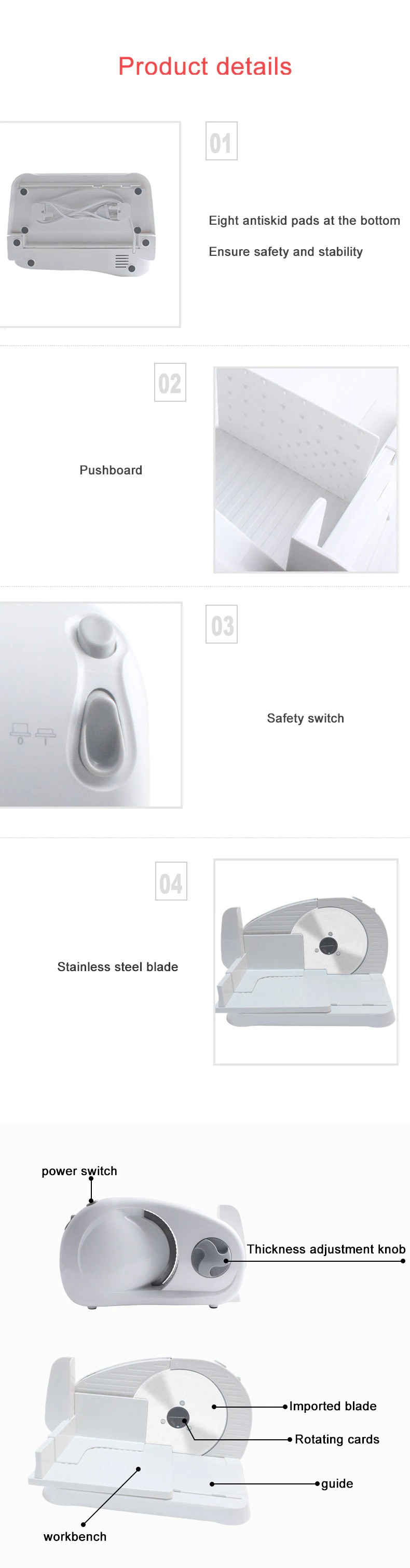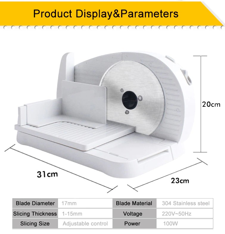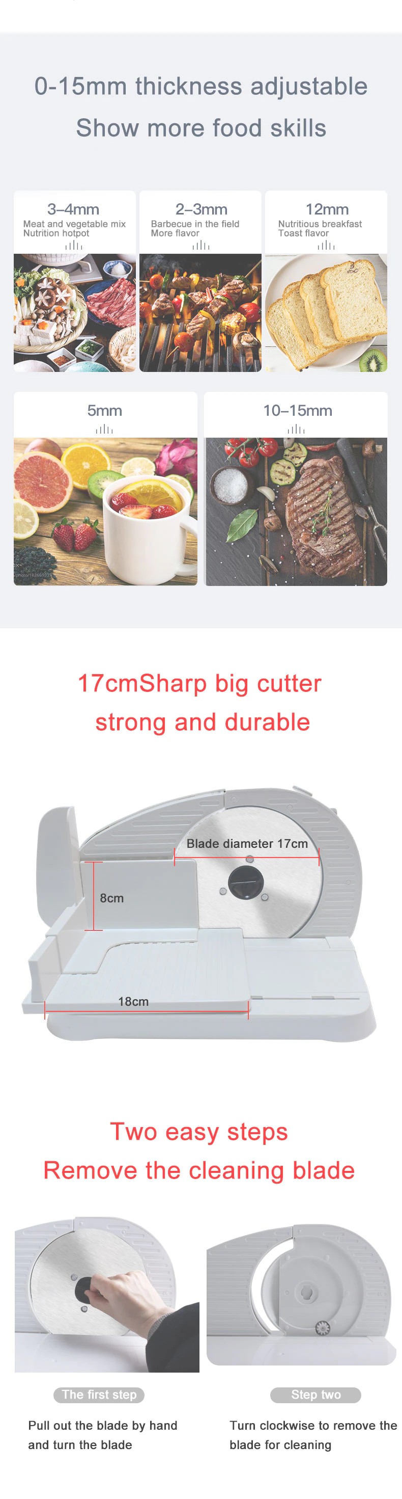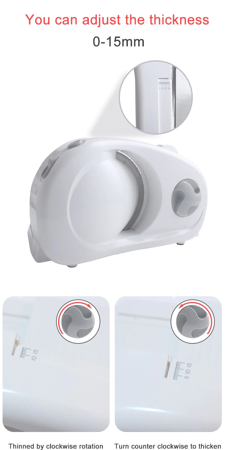 2. Aunque hay un ajuste de espesor de 0-15MM para la rebanadora, pero el grosor de 15mm solo es adecuado para rebanadas de pan, etc. como alimentos mullidos, no apto para carne congelada, no se puede cortar demasiado grueso, generalmente no se recomienda más de 3MM.