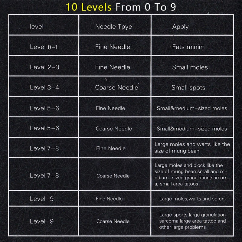 【 1 】 la máquina de belleza de la piel más actualizada: Nuestro bolígrafo de eliminación de etiquetas de piel se actualiza a 9 niveles. Puede controlar el nivel de fuerza en la pantalla LCD. 9 salidas de potencia de punto de escaneo ajustables diferentes para diferentes tratamientos: los niveles inferiores se utilizan en manchas y pecas y los niveles más fuertes se utilizan en lunares y etiquetas de piel.