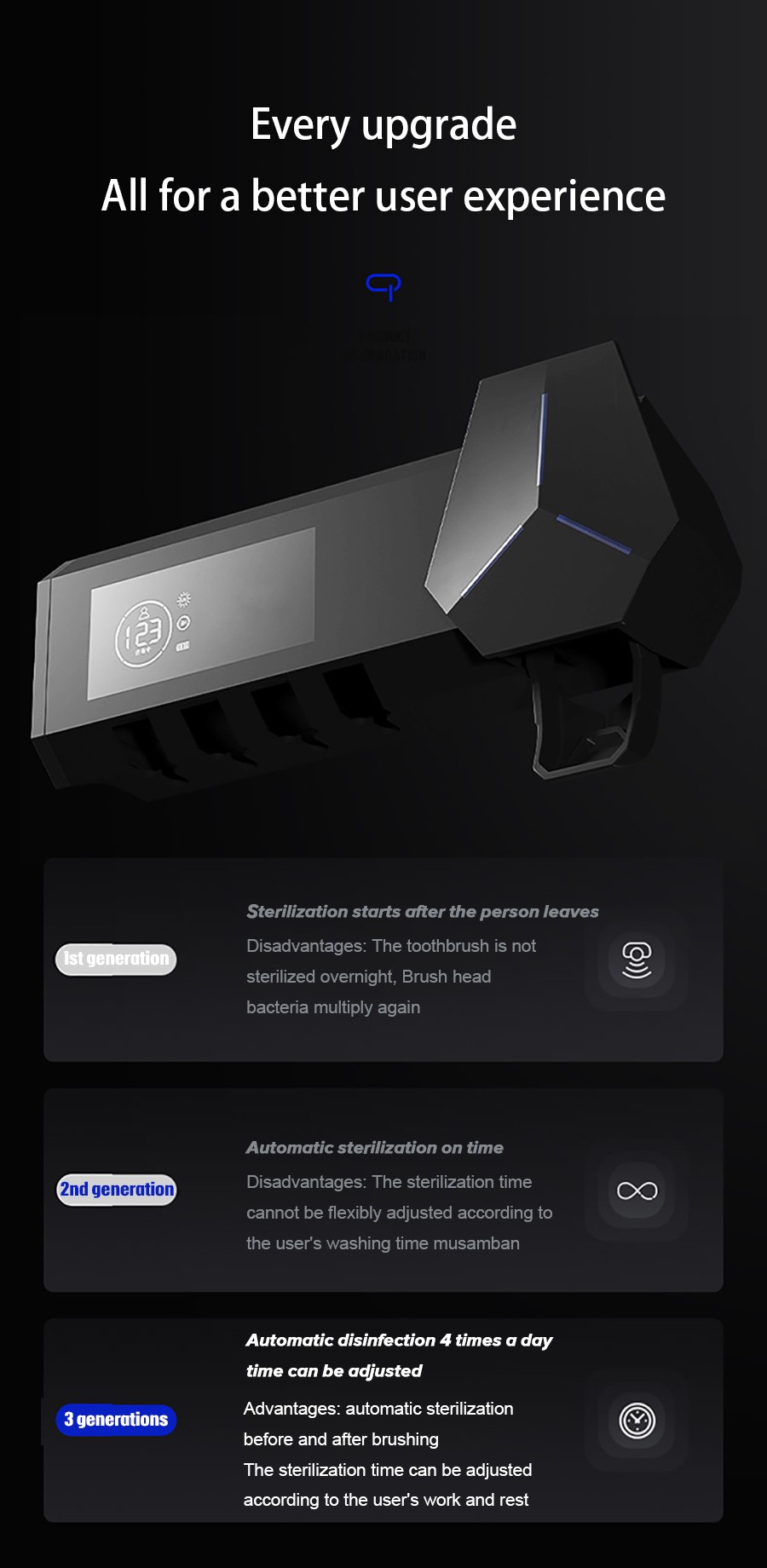 2. El primer producto del mercado que puede desinfectar tanto los cepillos de dientes como la pasta de dientes al mismo tiempo. No solo puede desinfectar los cepillos de dientes, sino también desinfectar las salidas de pasta de dientes, desinfección total.