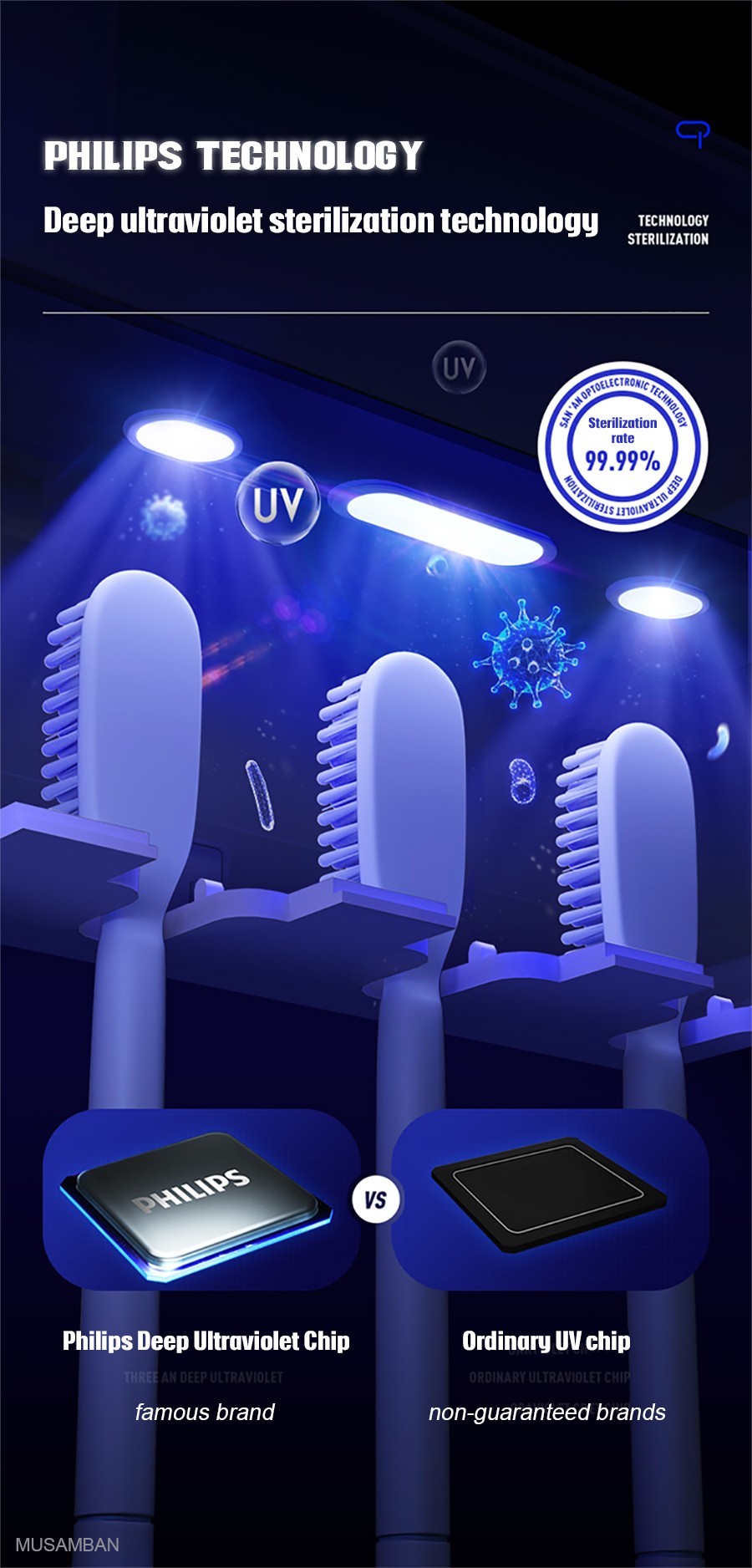 1. Equipado con tecnología de esterilización Philips, esterilización ultravioleta profunda, el efecto del producto está garantizado.