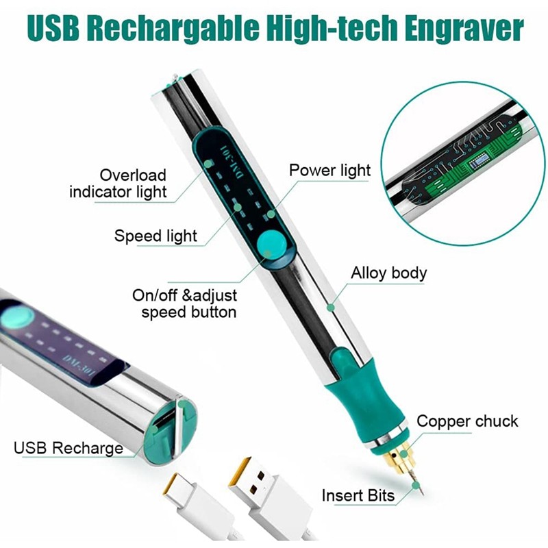 Grabador inalámbrico USB: esta herramienta de grabado está equipada con batería de litio y es recargable por interfaz USB. El uso inalámbrico se ralentará hasta 30 minutos después de la carga completa. Fácil de ayudarte a terminar una artesanía mejor grabada.