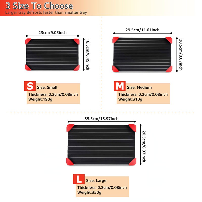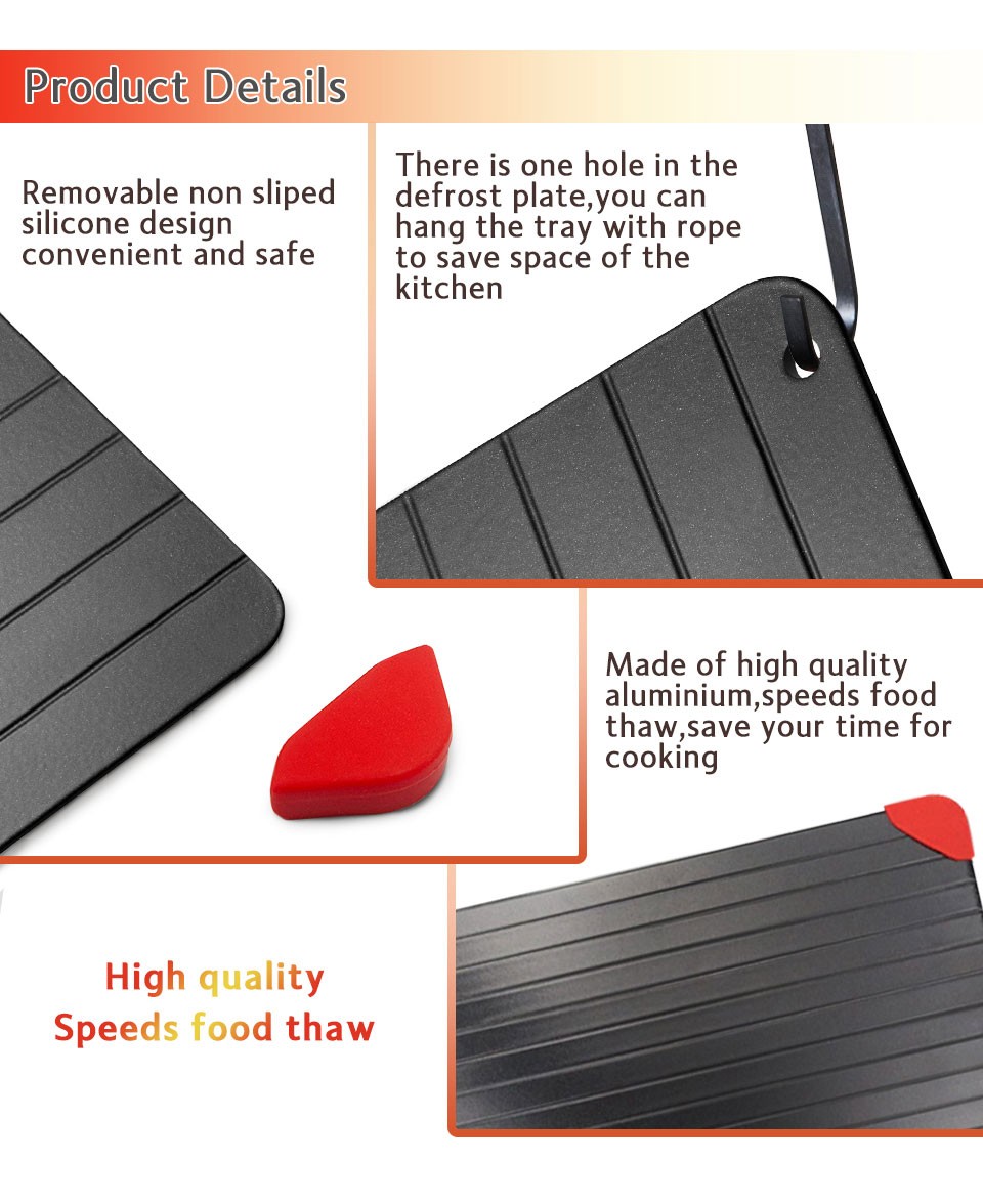 * El aluminio tiene conductividad térmica y velocidades de descongelación de alimentos, y el tamaño grande de la estera de descongelación para carne congelada es más rápido que el pequeño, lo que le ahorrará más tiempo mientras cocina.