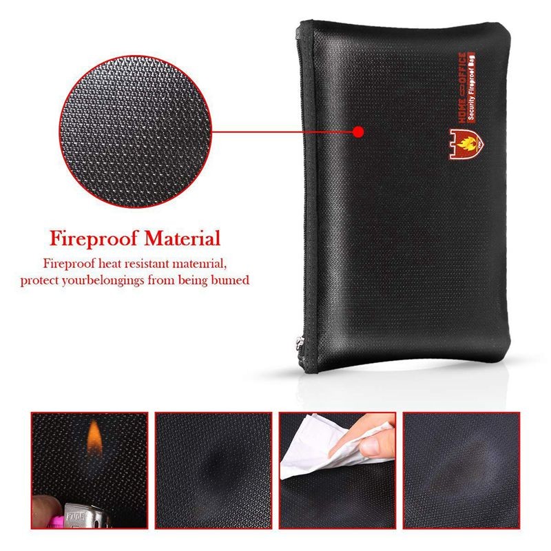 Hecho de silicona líquida de alta calidad con revestimiento exterior de fibra de vidrio retardante. Que puede soportar temperaturas de hasta 700 Celsius (aproximadamente 1292 Fahrenheit ), para que pueda mantener todos sus objetos de valor 100% seguros, esta bolsa para documentos brinda tranquilidad en caso de incendio o robo. Funciona muy bien Si necesita salir para una emergencia climática también rápidamente.