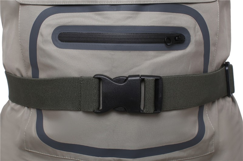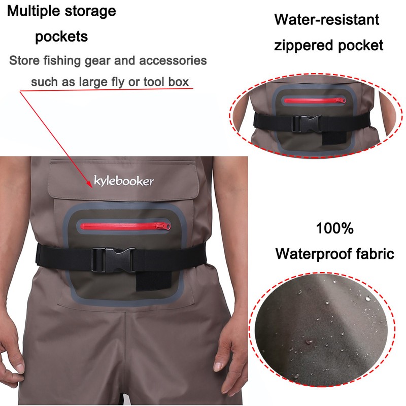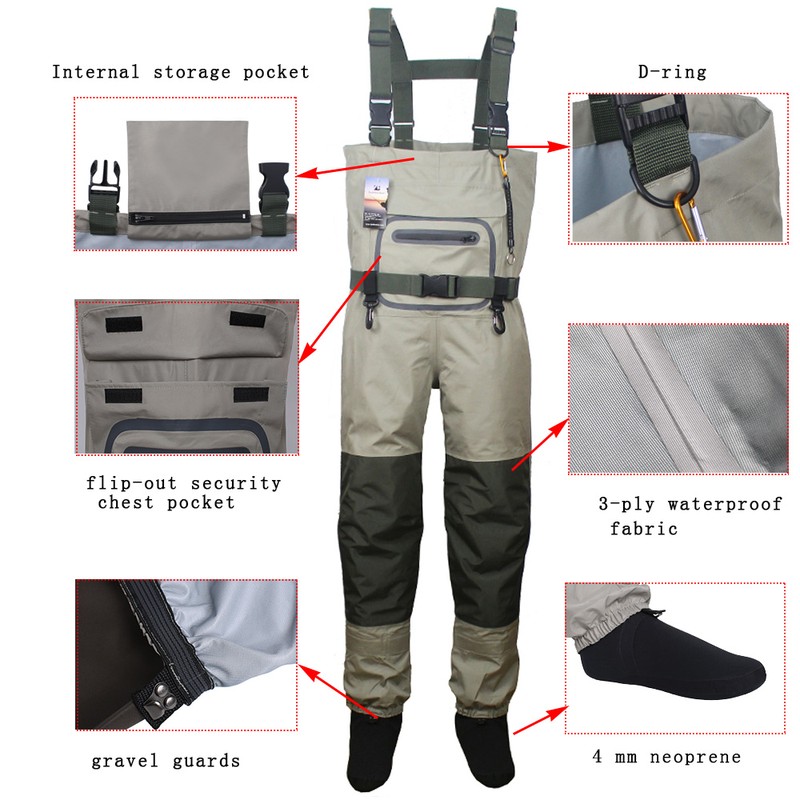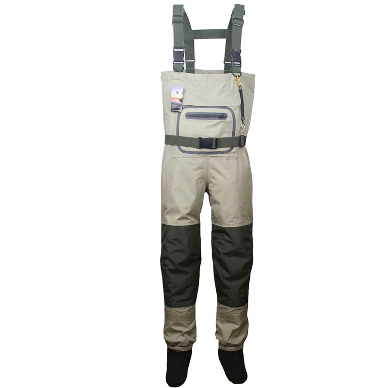 Cómodo Pie de almacenamiento waders transpirables con Tirantes ajustables, bolsillo calentador de manos y protectores de grava adjuntos.
