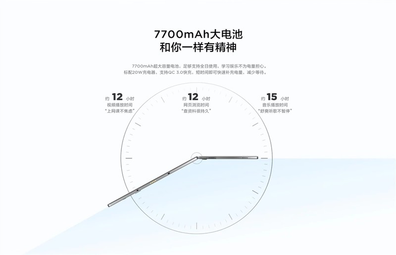 Batería de gran capacidad de 7700 mah, suficiente soporte usando tiempo completo, aprendizaje de entretenimiento para no preocuparse por la electricidad. Cargador estándar de 20 w, compatible con carga rápida QC 3,0, puede agregar capacidad rápidamente en poco tiempo, reducir la espera.