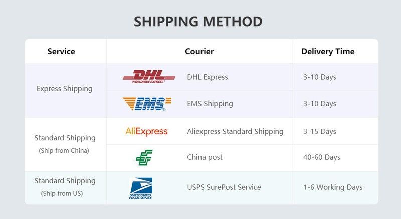 3)Envío:Enviaremos los pedidos dentro de las 48 horas posteriores al pago. La mayoría de los números de seguimiento pueden ser rastreados dentro de 1-7 días.