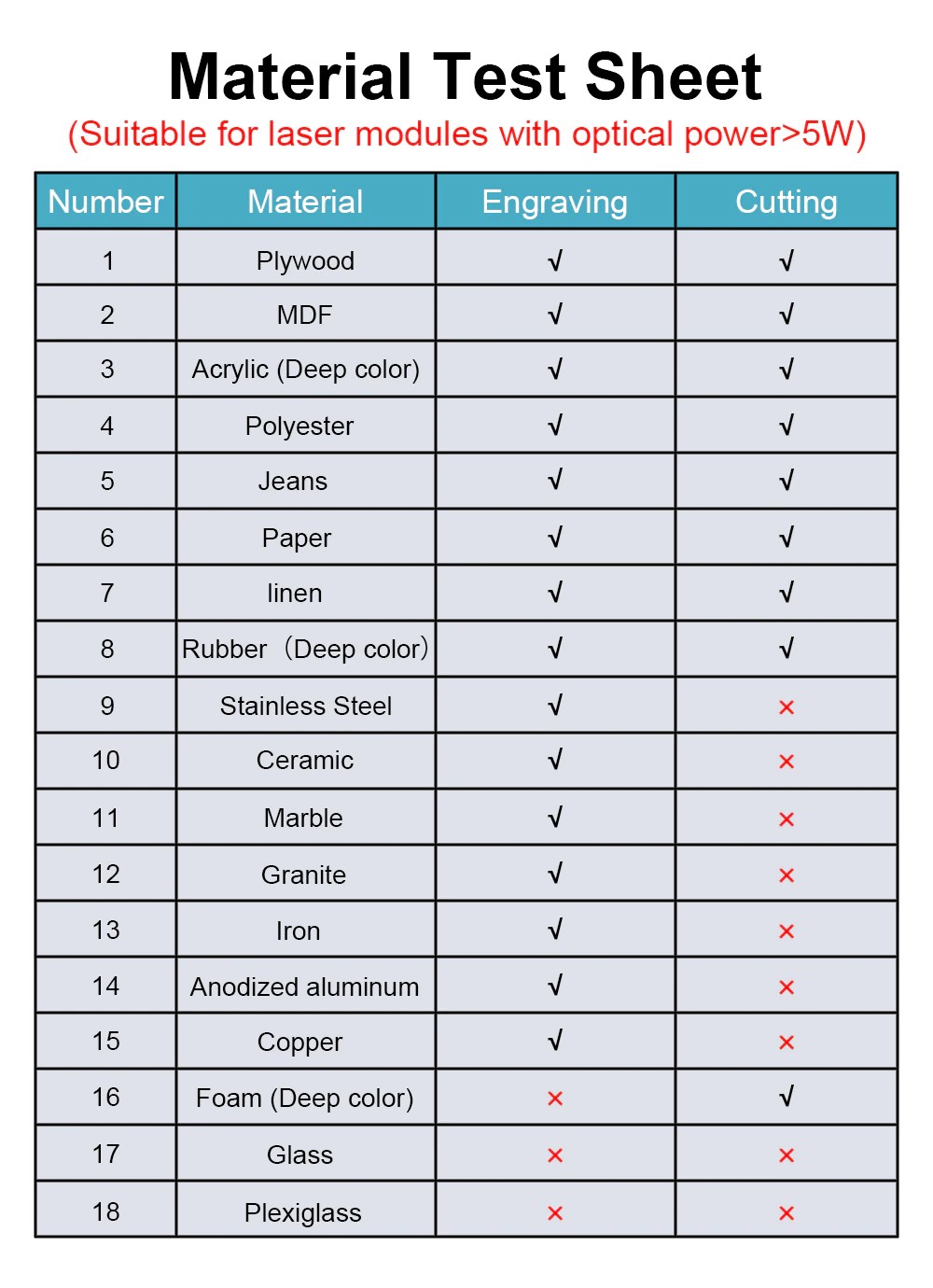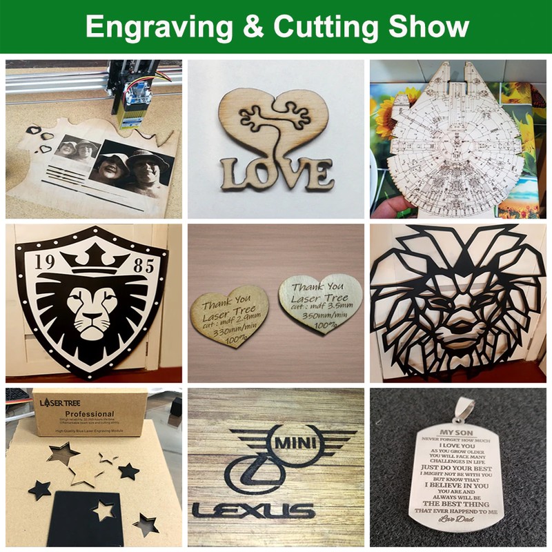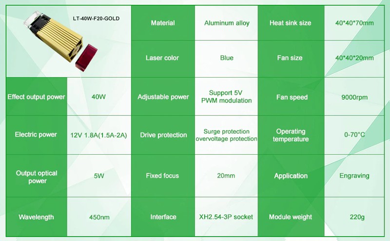 El módulo láser azul está especialmente diseñado para fresadoras CNC y grabado DIY. La longitud de onda es de NM, que es una herramienta eficaz para grabado y corte láser. Pueden grabar y cortar varios materiales.