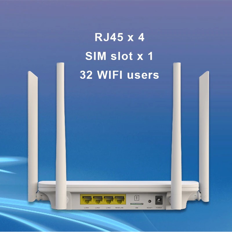 LC116 4G CPE es un enrutador wifi 4G LTE de escritorio, tiene cuatro antenas externas, 4 puertos RJ45, admite 32 usuarios WiFi, usa tarjeta Micro SIM.