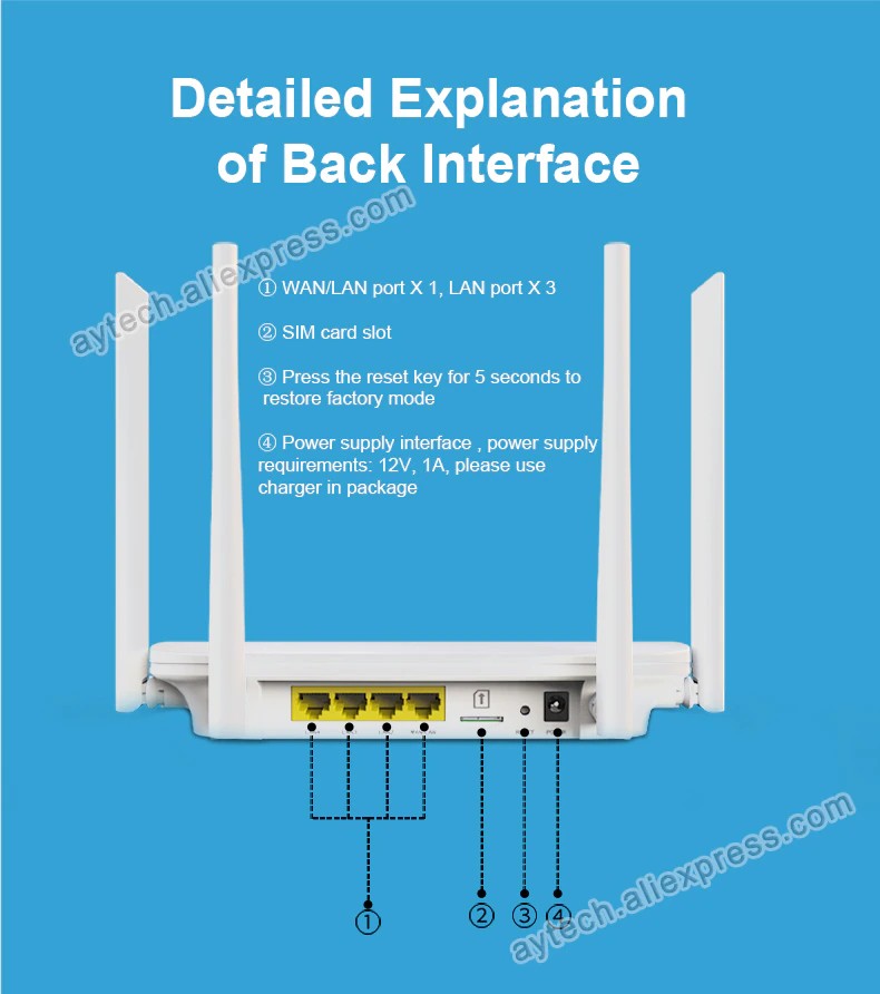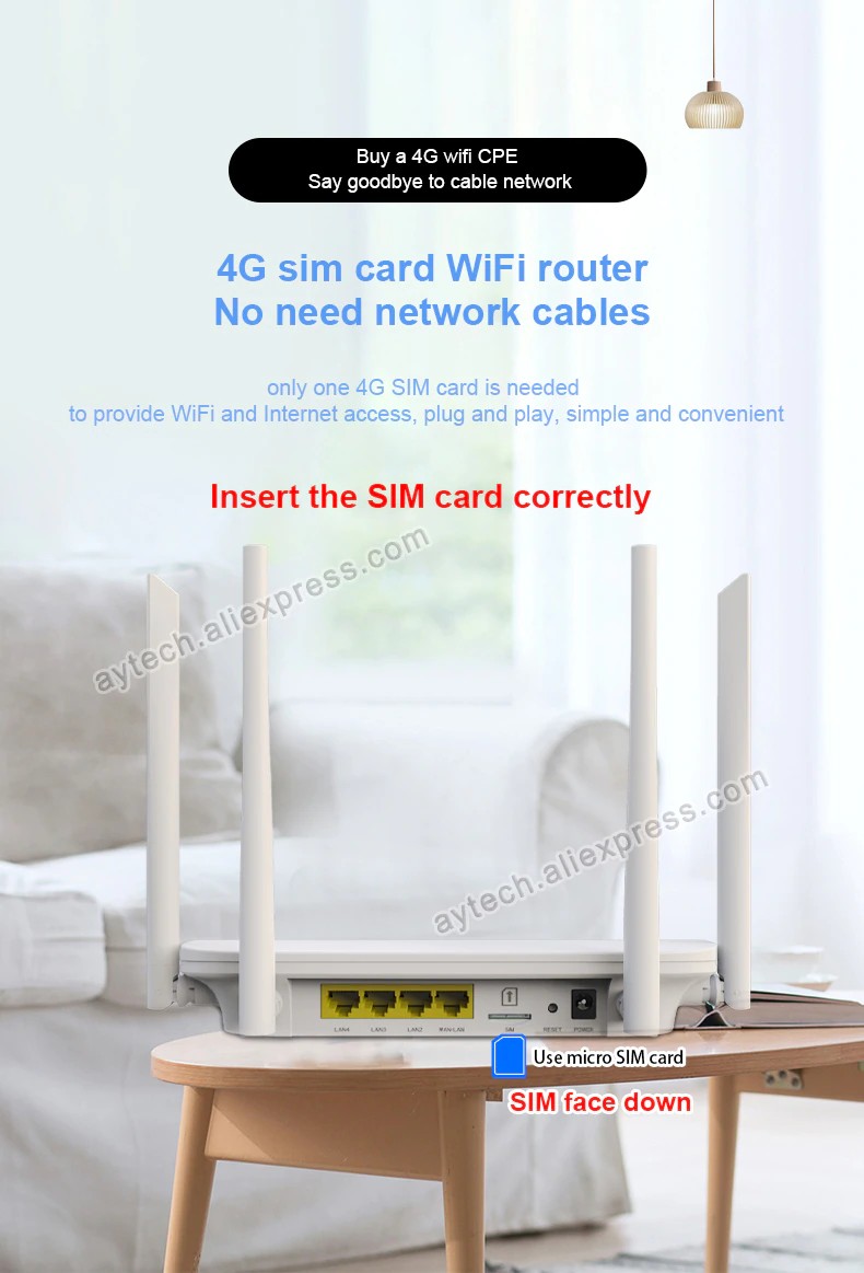 1. Nuestro enrutador/módem 4G solo admite tarjetas SIM normales universales. Para algunas tarjetas SIM bloqueadas, contrate tarjetas SIM que los operadores no permiten usar en enrutadores wifi o solo permiten usar en sus dispositivos autorizados. Es posible que este artículo no funcione. (Si su tarjeta SIM no puede acceder a Internet, por favor no se preocupe. Por lo general, cambia la tarjeta SIM universal de otro operador, entonces funcionará. O puede contactarnos para obtener ayuda.)