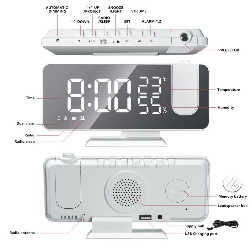 Reloj De Mesa De Noche Con Alarma Digital Led, Despertador Electrónico Escritorio Con Usb, Radio Fm, Proyector Hora Y Función De Repetición