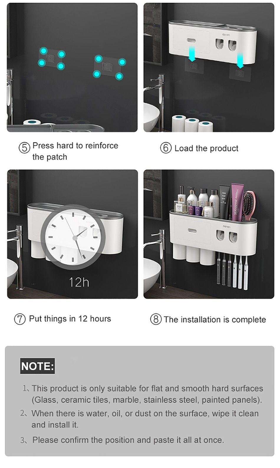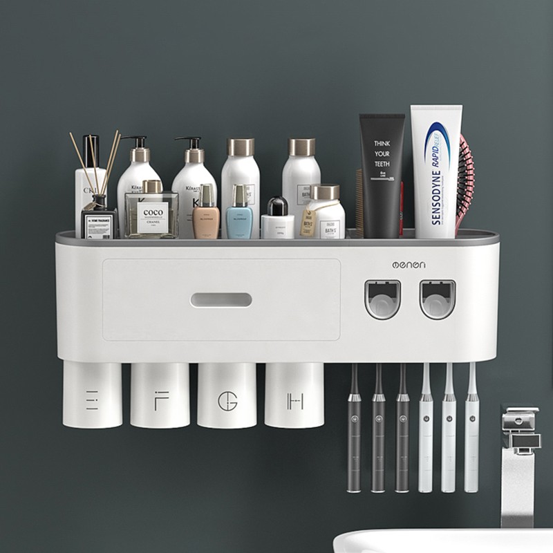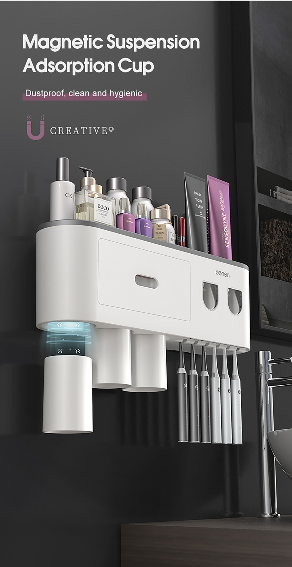 2. Soporte de cepillo de dientes multifuncional, que integra soporte de cepillo de dientes + 2 exprimidor de pasta de dientes + Almacenamiento en uno, no ocupa espacio y es conveniente y práctico