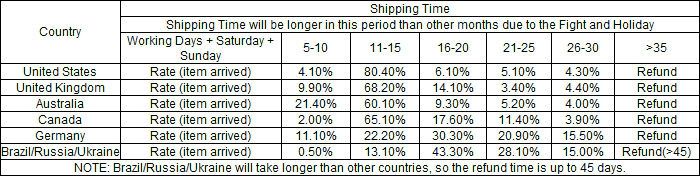 - Los artículos llegarán en 7-25 días hábiles a todo el mundo generalmente. Y la hora de llegada también depende de algunos factores y diferentes áreas.