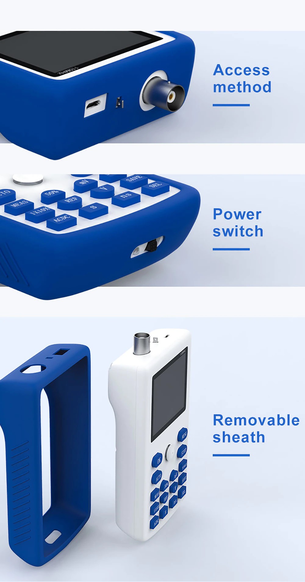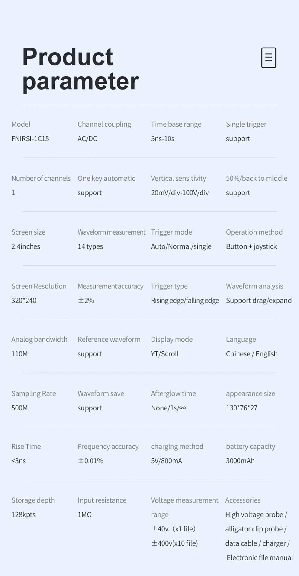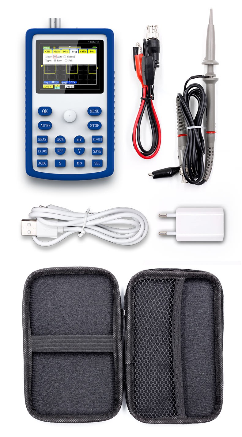 FNIRSI-1C15 es un osciloscopio portátil totalmente funcional, práctico y rentable lanzado recientemente por FNIRSI. La velocidad de muestreo en tiempo real es de 500M y el ancho de banda analógico es de 110MHz. Además de todas las funciones de un osciloscopio portátil convencional, También añadimos una función automática rápida de una tecla sobre esta base, para que pueda agarrar fácilmente la forma de onda como un ordenador de escritorio. Hemos añadido una onda cuadrada autoprobada de 1k Hz para FNIRSI-1C15, y la profundidad de almacenamiento se ha actualizado a 12kpts. Con referencia a la forma de onda, puede pausar en cualquier momento para guardar la forma de onda de marco anterior en la pantalla, y puede compararla con la forma de onda actualizada actualmente. Los modos de brillo posterior y desplazamiento facilitan la detección y registro de formas de onda. Batería recargable integrada de 3000mAH, puede trabajar continuamente durante más de 10 horas después de cargarse completamente. El cuerpo está equipado con una funda de silicona de alta calidad, antideslizante y anticaída. El joystick reemplaza las teclas de flecha originales, haciendo la operación más simple y más efectiva.