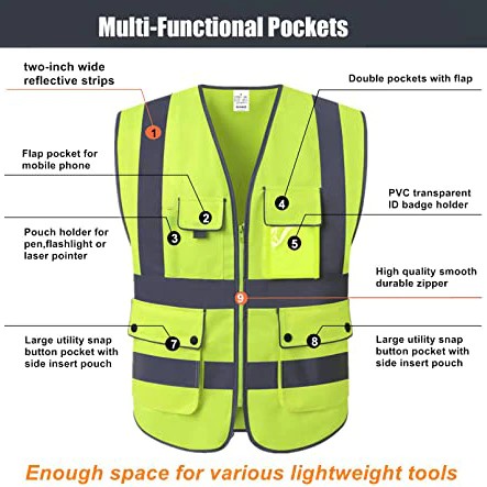 Bolsillos multifunción-Chaleco de seguridad de alta visibilidad diseñado con 5 bolsillos, 3 de los cuales tienen velcro flip-top para evitar que los artículos se caigan, 1 clip de insignia de identificación transparente de PVC en la parte delantera,. 1 bolsillo con solapa y 1 bolsillo pequeño para herramientas como linternas o bolígrafos. A continuación se muestran dos bolsillos de gran capacidad que pueden contener teléfonos móviles, cuadernos y otros artículos.