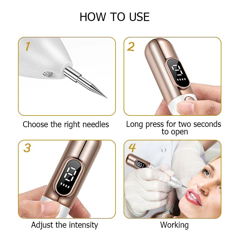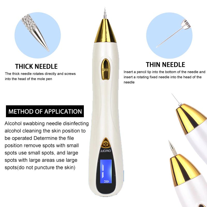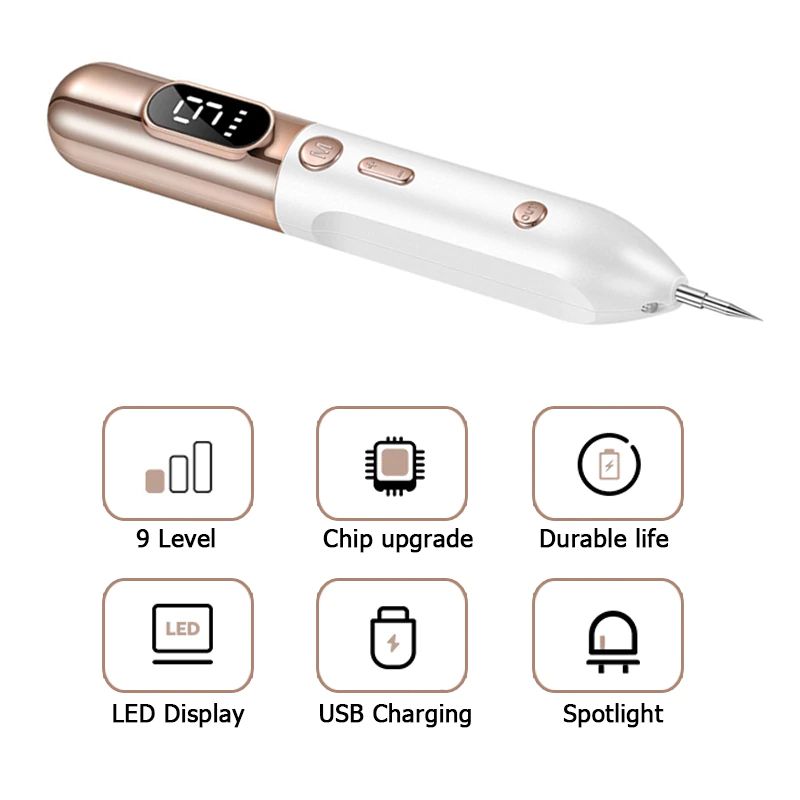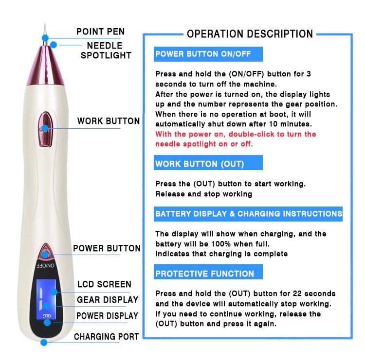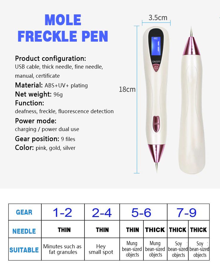 Este bolígrafo utiliza tratamiento de iones eléctricos y control por microordenador paraEliminar las hemorroides, manchas, hemorroides de la carne,PecasMono, verrugas, punto de melanina, tatuajeDe manera efectiva, sin dolor, sin sangrado, muy seguro. Cuerpo ligero, fácil de usar, es realmente bonito.