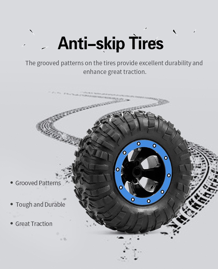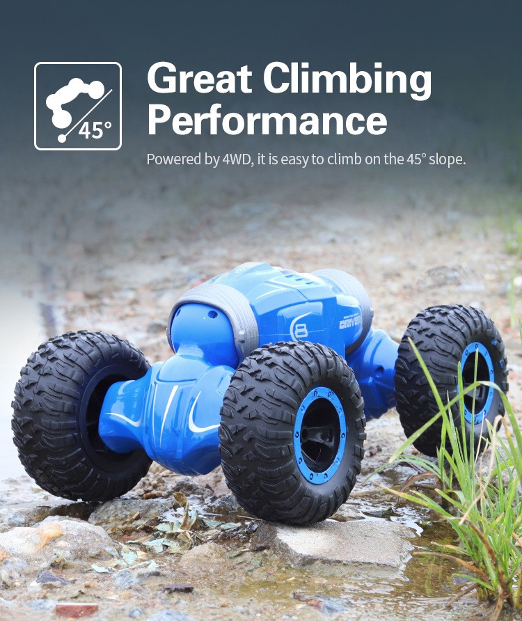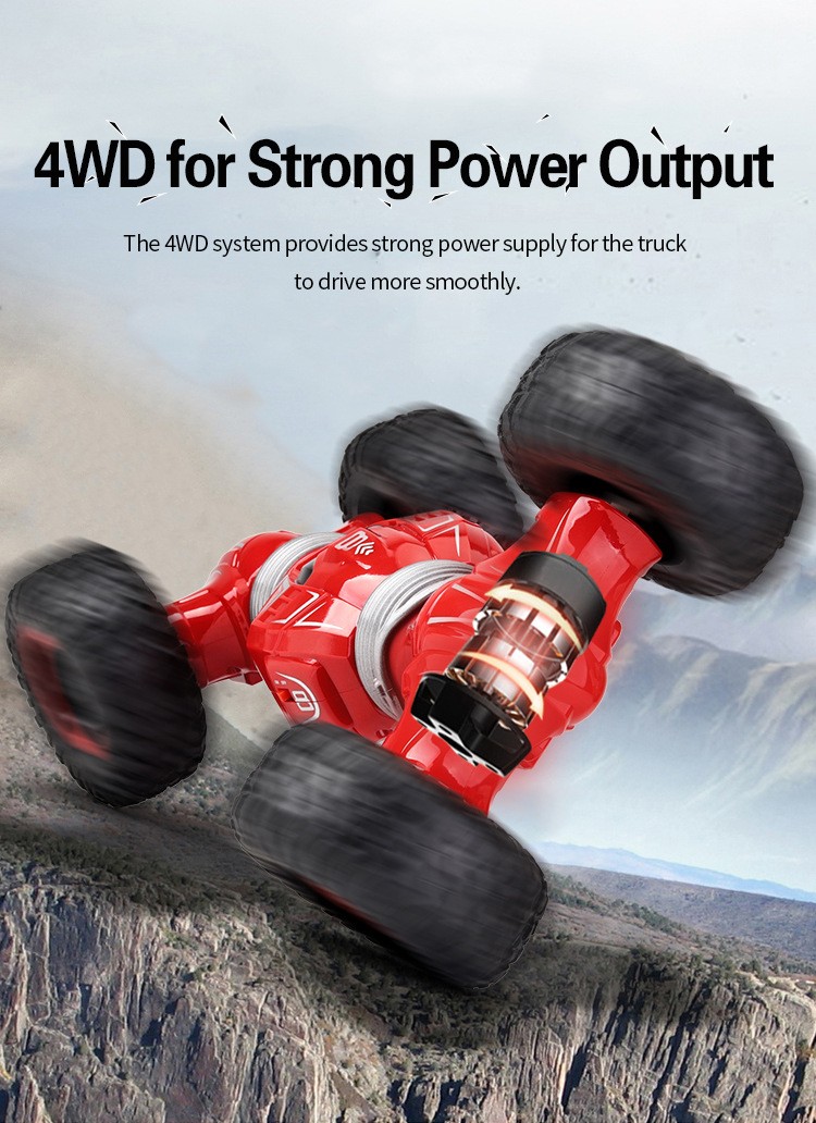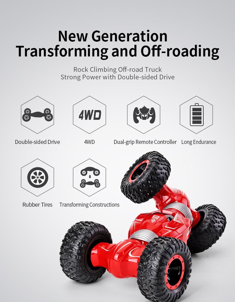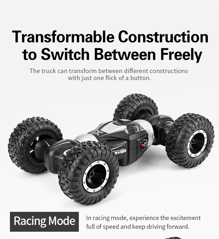 Este camión de control remoto adopta la tecnología de control remoto de 2.4Ghz, lo que le permite controlar de forma remota funciones como avance, retroceso, izquierda, derecha, transformación y visualización automática, etc. Su gran capacidad de escalada, además de sistemas de conducción 4WD y de doble cara, le ofrece una experiencia definitiva y duradera llena de emoción con su largo tiempo de juego.