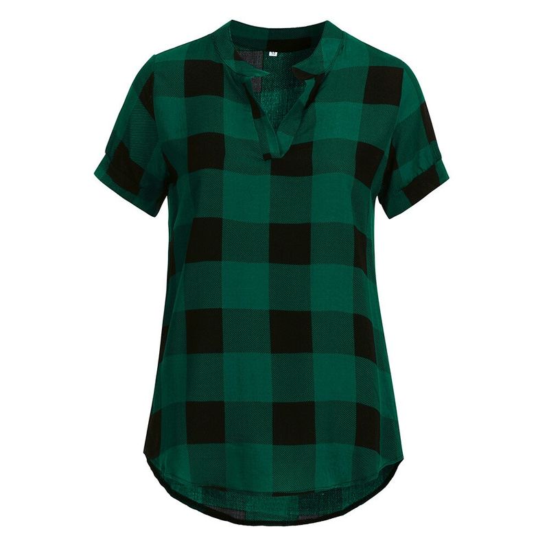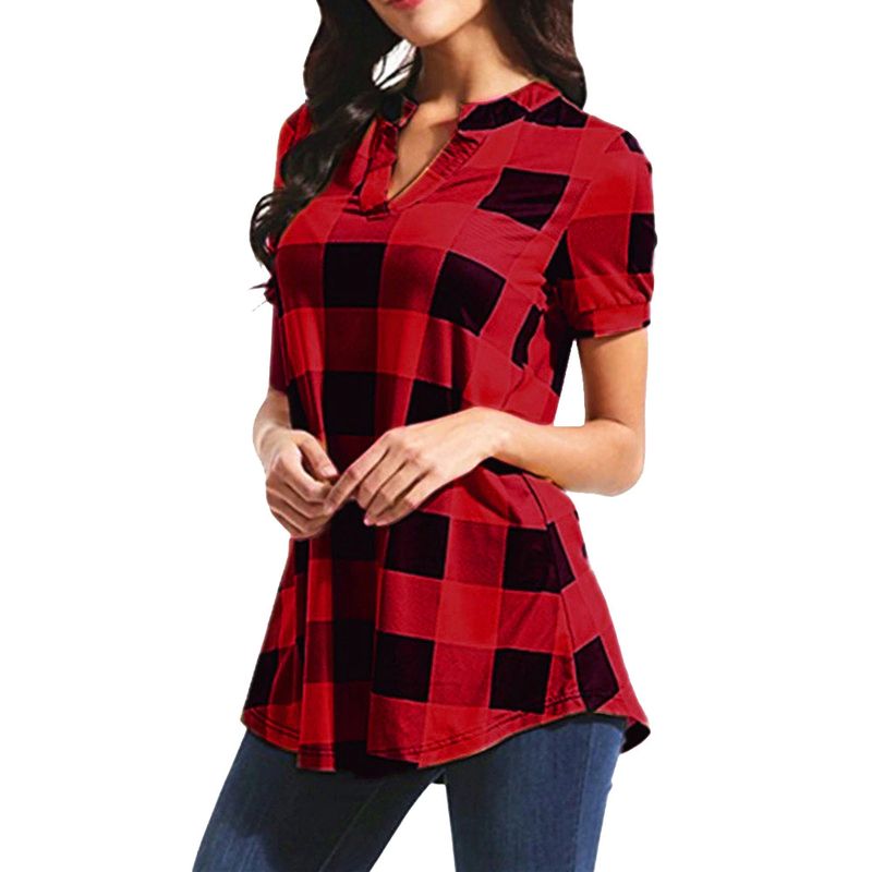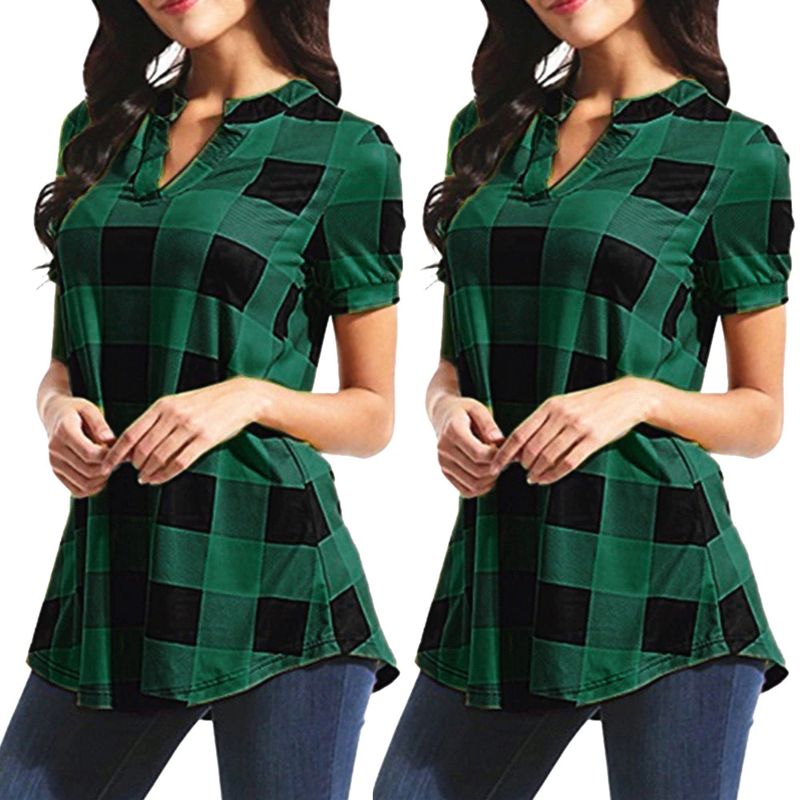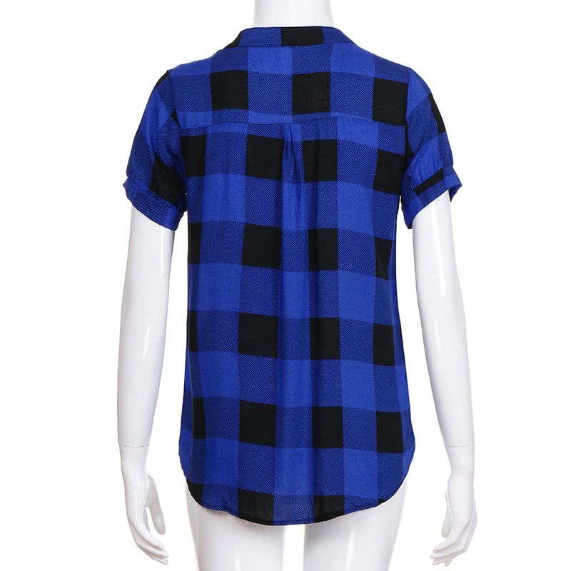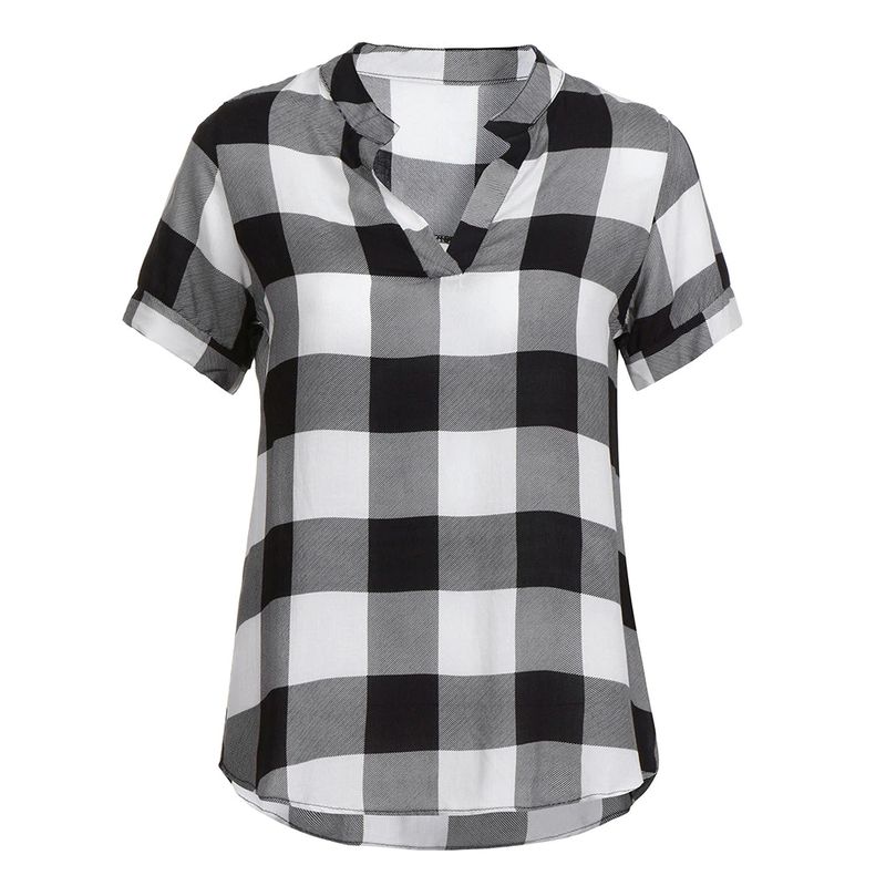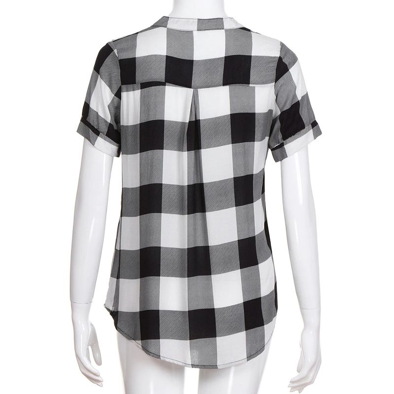 Mujeres Casual Plaid impreso manga corta cuello en V Irregular Hem blusa camiseta Tops