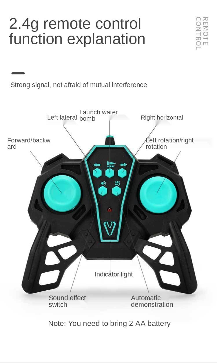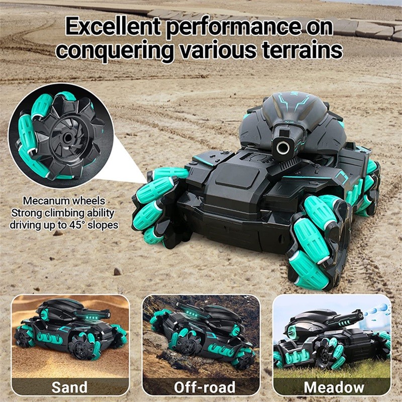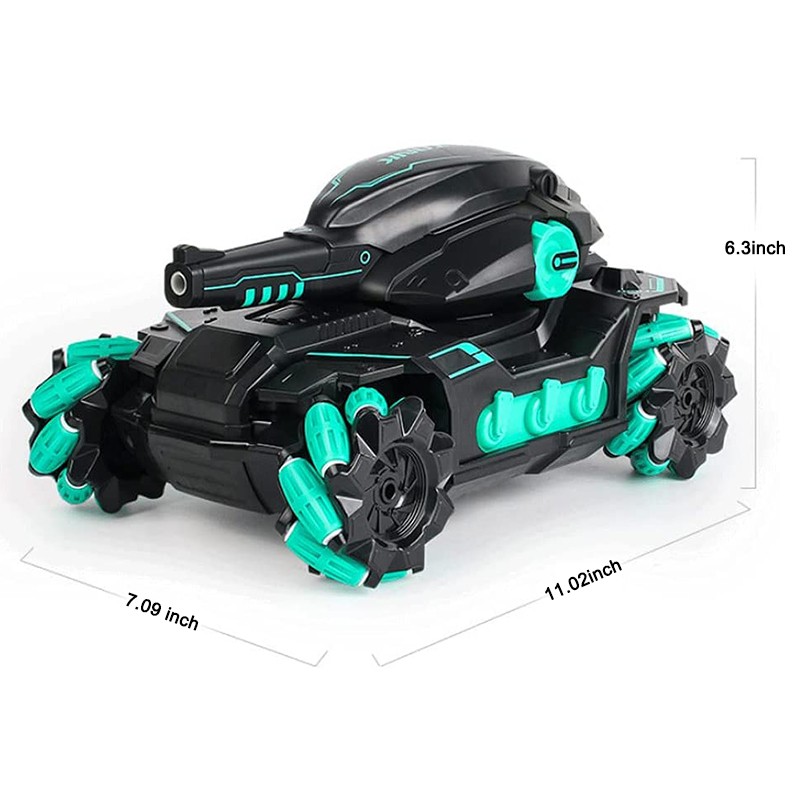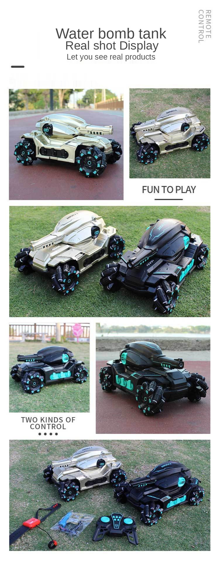 Control remoto de 2,4G, puede derrapar rápidamente, estilo fresco, puede girar 360 ° en su lugar, disparar bombas de agua, con efectos de sonido y luz, soporta la duración de la batería de carga, le brinda más felicidad.