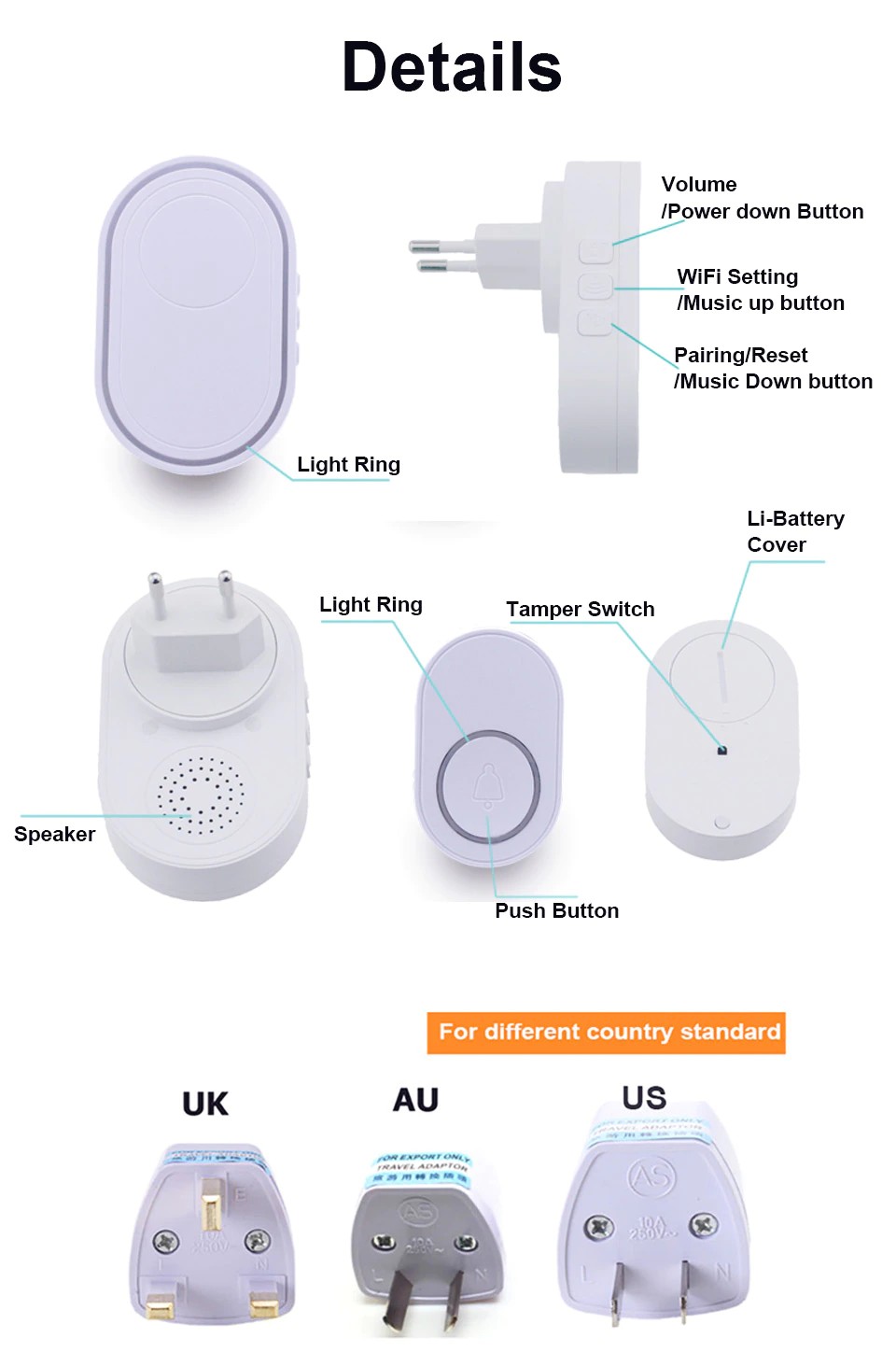 -En casa, con alarma local/LED parpadeante Aviso de voz y notificación, se puede ajustar el volumen de 5 niveles, 58 canciones opcionales