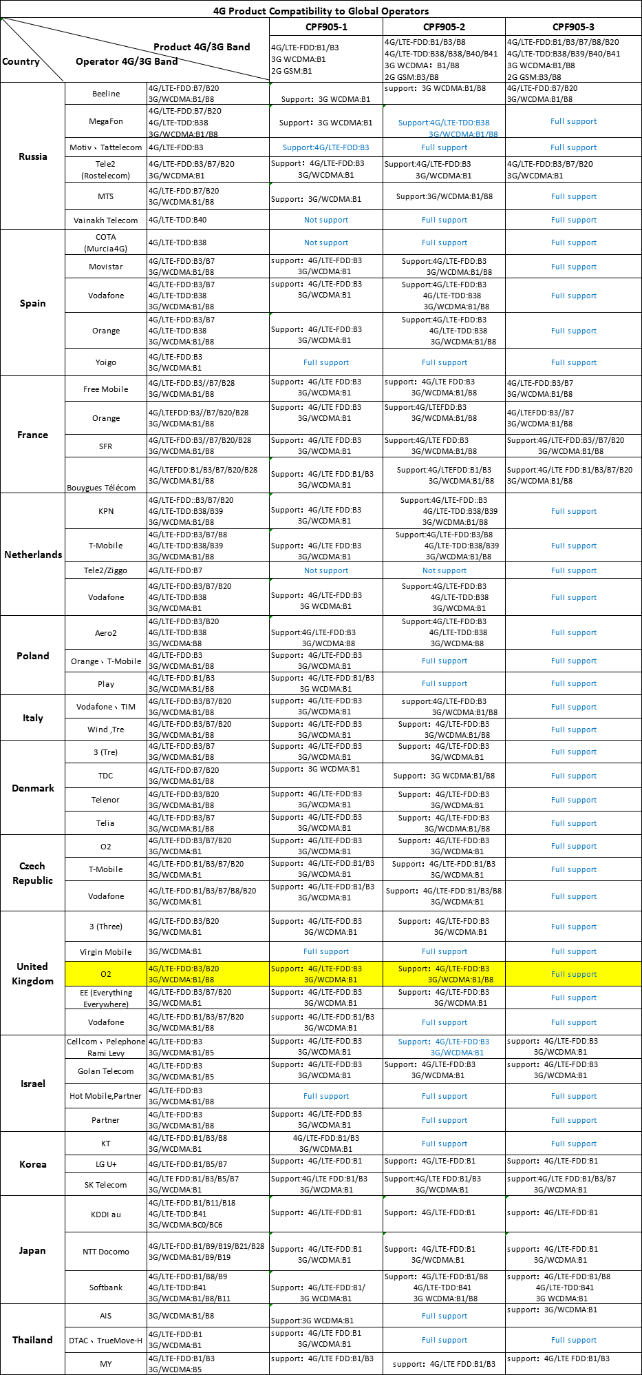 4G LTE FDD: B1 / B3 / B7 / B8 / B20 (2100/1800/2600/900/800 MHZ)