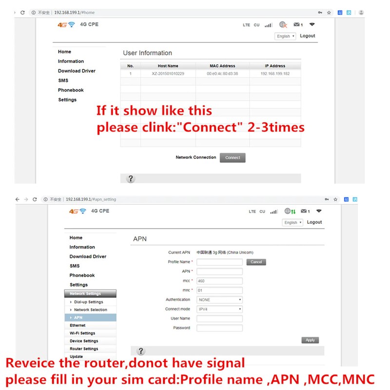 5.Al obtener acceso a Internet a través de un cable ethernet; Obtenga acceso a Internet a través de 4G / 3G / 2G Obtenga acceso a Internet insertando la tarjeta SIM y conectándose al dispositivo (el modo SIM 4G debe confirmar que la frecuencia LTE es compatible y que el APN es correcto)