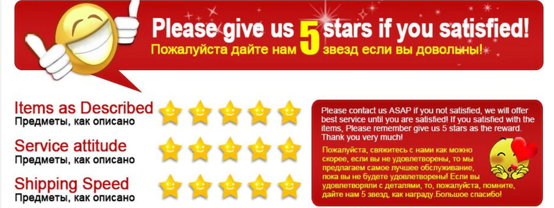 1. Estimado cliente, su opinión es muy importante para nosotros, si está satisfecho con nuestros productos, por favor denos una muy buena opinión en unos segundos (las 5 estrellas), muchas Gracias 2. Siempre le ofrecemos el mejores productos y los servicios, Y le ofrecemos los mejores precios 3. Contáctenos antes de darnos una valoración neutral (3 estrellas) o negativa (1-2 estrellas). Haremos todo lo posible para resolver sus problemas y ofrecerle un ambiente de compra feliz. Si tiene alguna pregunta, no dude en contactarnos, le responderemos lo antes posible. Gracias por su visita y le deseamos un hermoso y feliz día