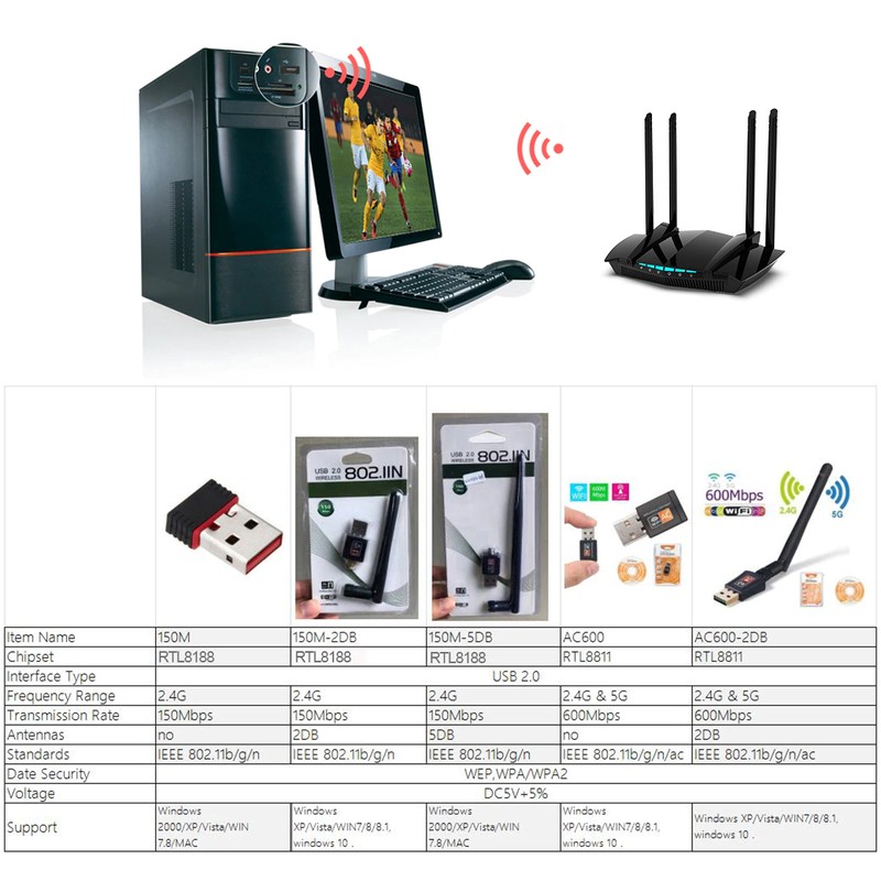 Adaptador Wifi Mini Usb Inalámbrico, Receptor Dongle De 150/ 600Mbps, Mtk7601/Rtl8188 Tarjeta De Red 802.11Ac Para Ordenador De Escritorio Portátil, Windows Y Mac