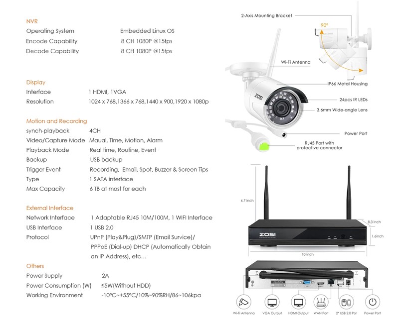 Zosi-Sistema De Seguridad Cctv Inalámbrico Para Exteriores, Kit De Videovigilancia De 8 Canales, H.265 3Mp Nvr 1080P 2Mp Cámara Ip, Wifi
