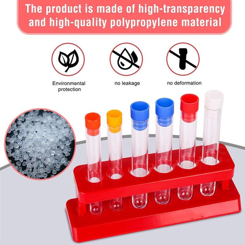 Le paquet est livré avec 6 tubes à essai et 1 étagère de rangement avec 6 trous, une belle combinaison à utiliser. Fabriqué en matière plastique de haute qualité, sans danger, sûr et durable à utiliser, pas facile à casser ou à déformer, longue durée de vie.Caractéristiques