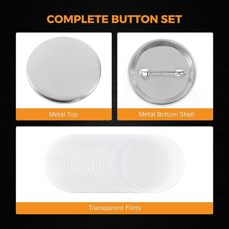 Ensemble complet-chaque ensemble comprend: 1 * coque inférieure de badge en fer mat, 1 * anneau en caoutchouc, 1 * couvercle supérieur de broche en fer et un morceau de film plastique transparent. Avec cet ensemble, vous pouvez créer 100 boutons pin arrière en métal mat. Les pièces métalliques mates ont une meilleure texture et sont plus durables que les autres en plastique.